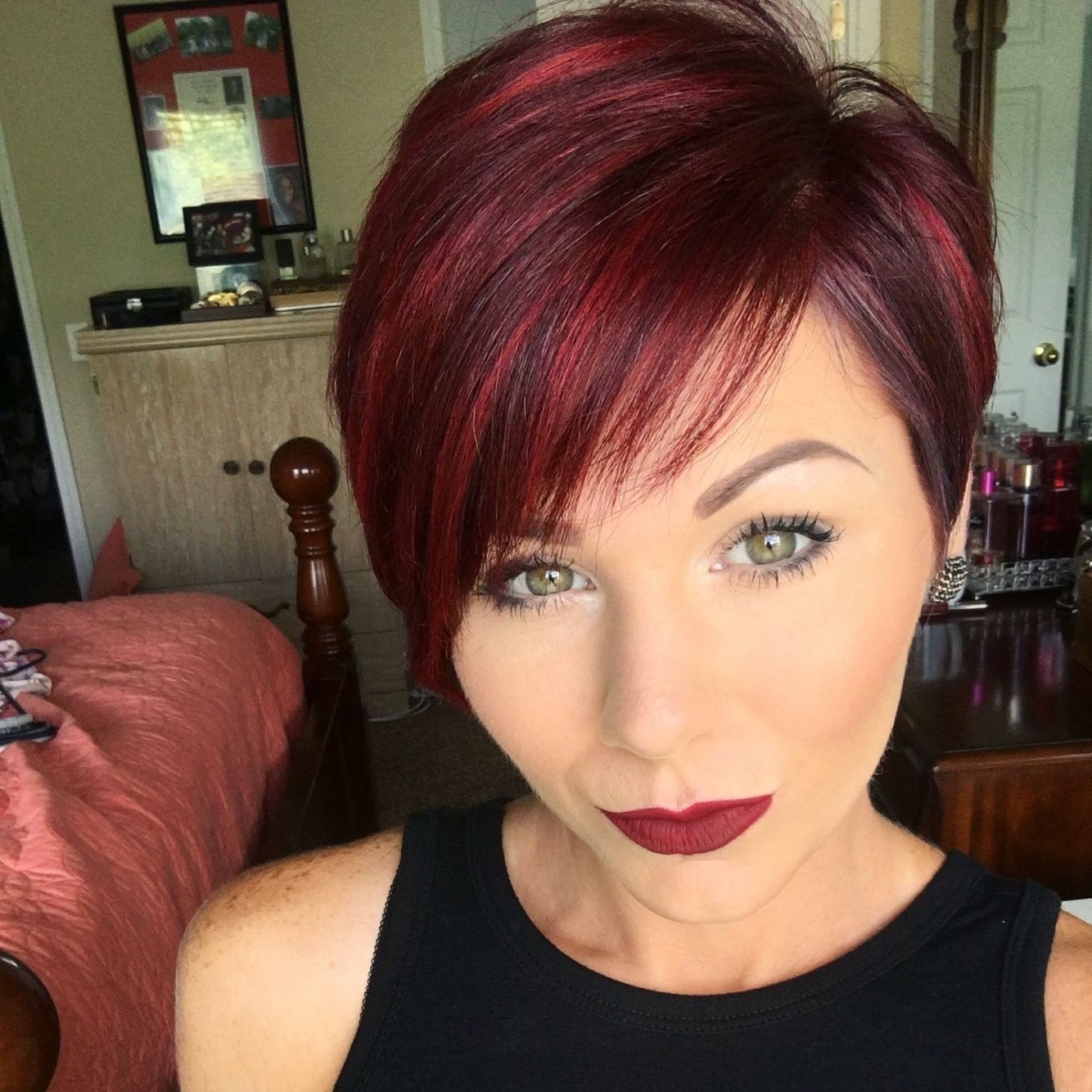 На коротких стрижках,черно красные волосы