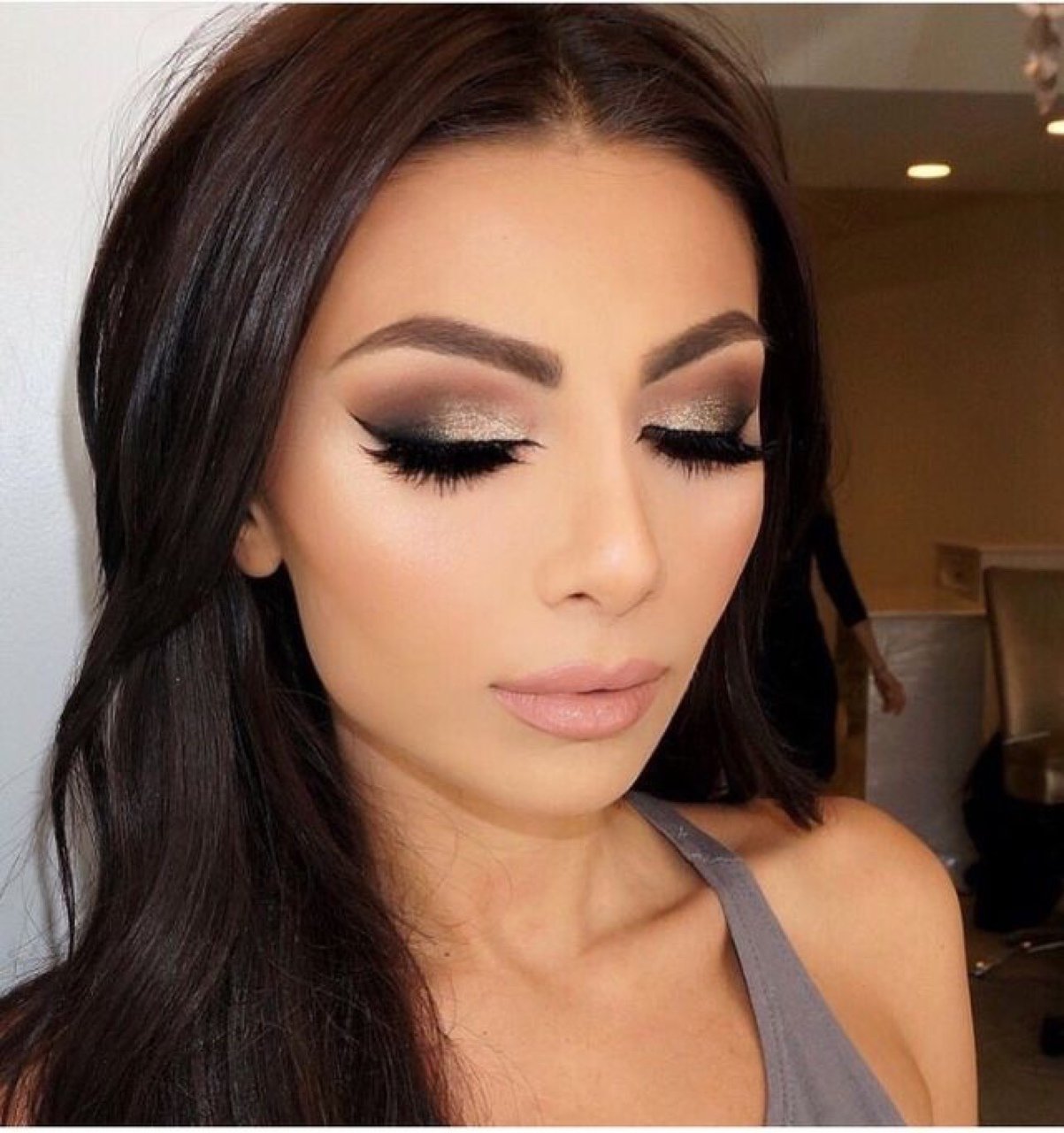 Макияж под бежевое платье для карих глаз