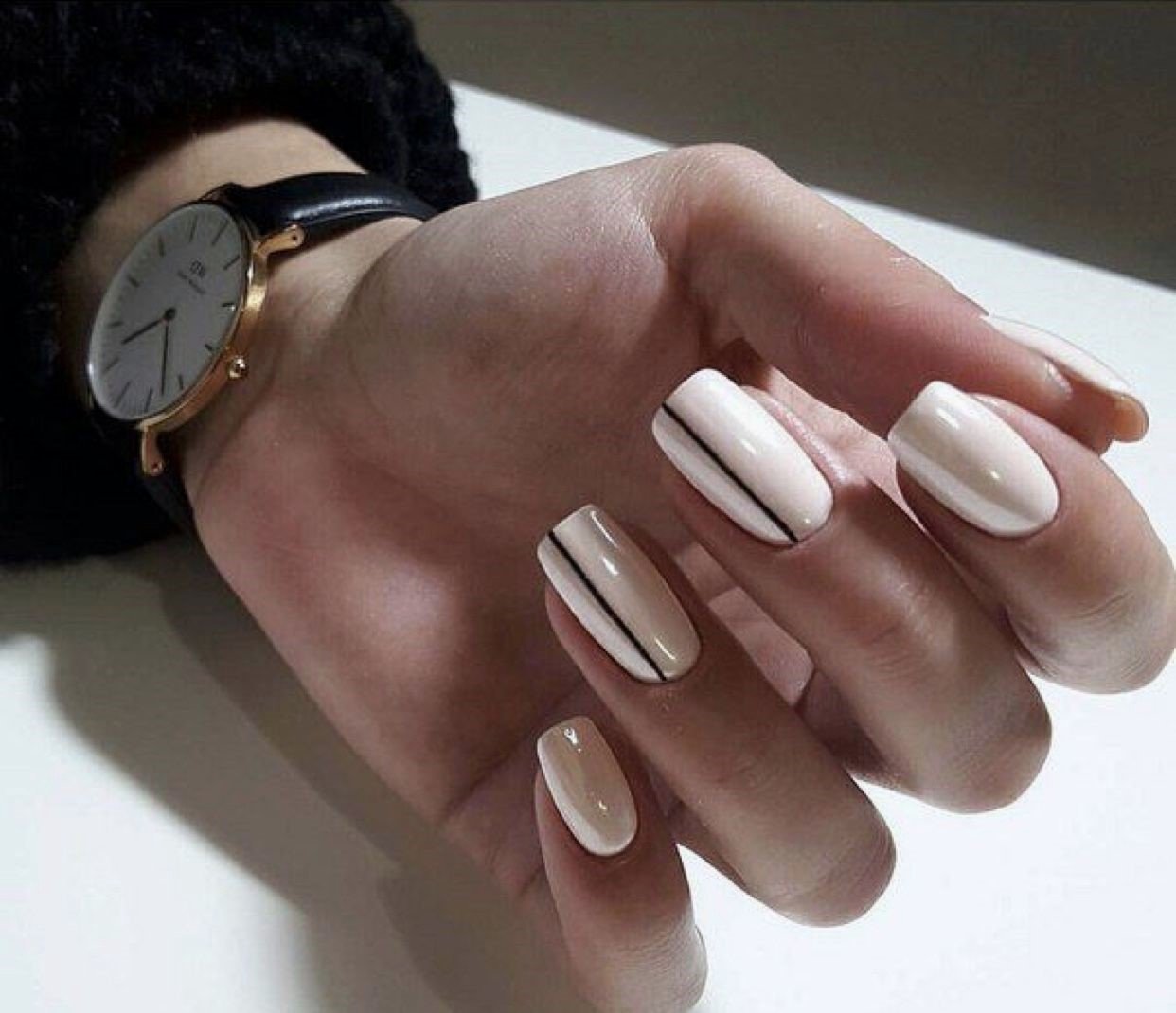 Бежевый маникюр с черными полосками