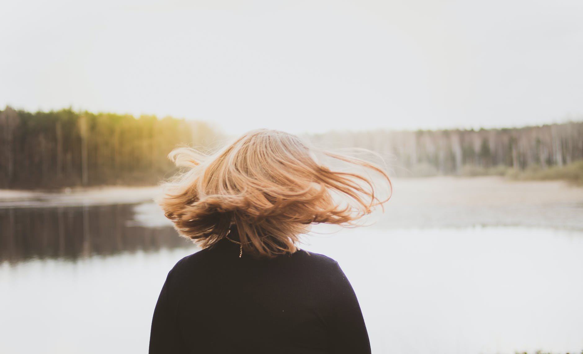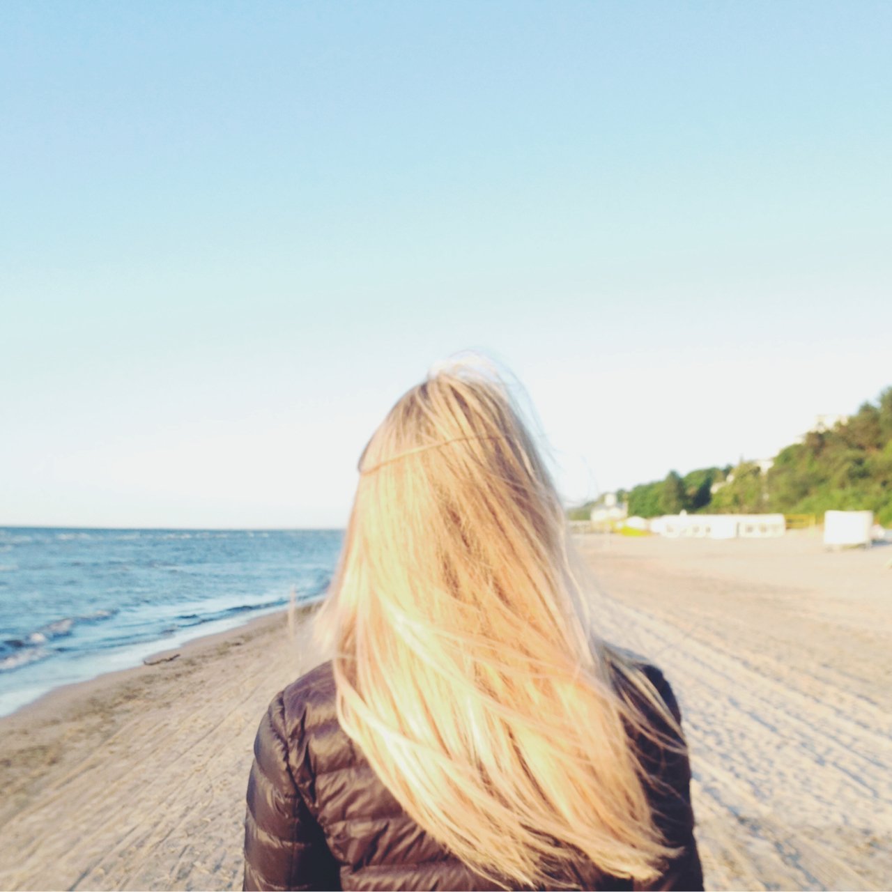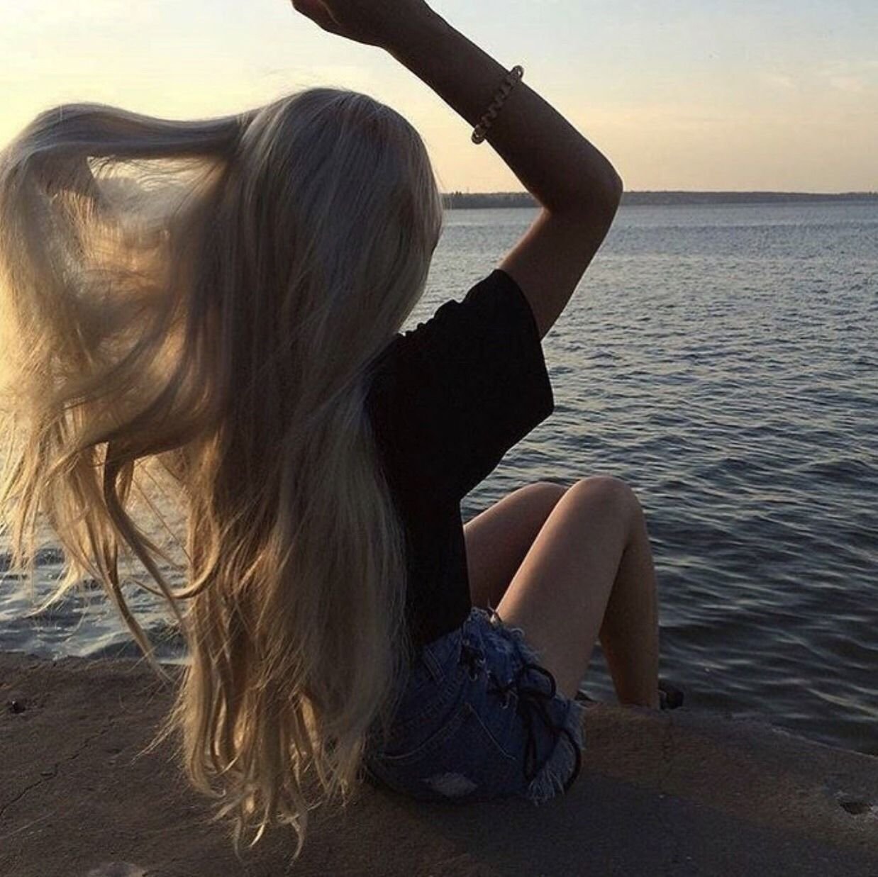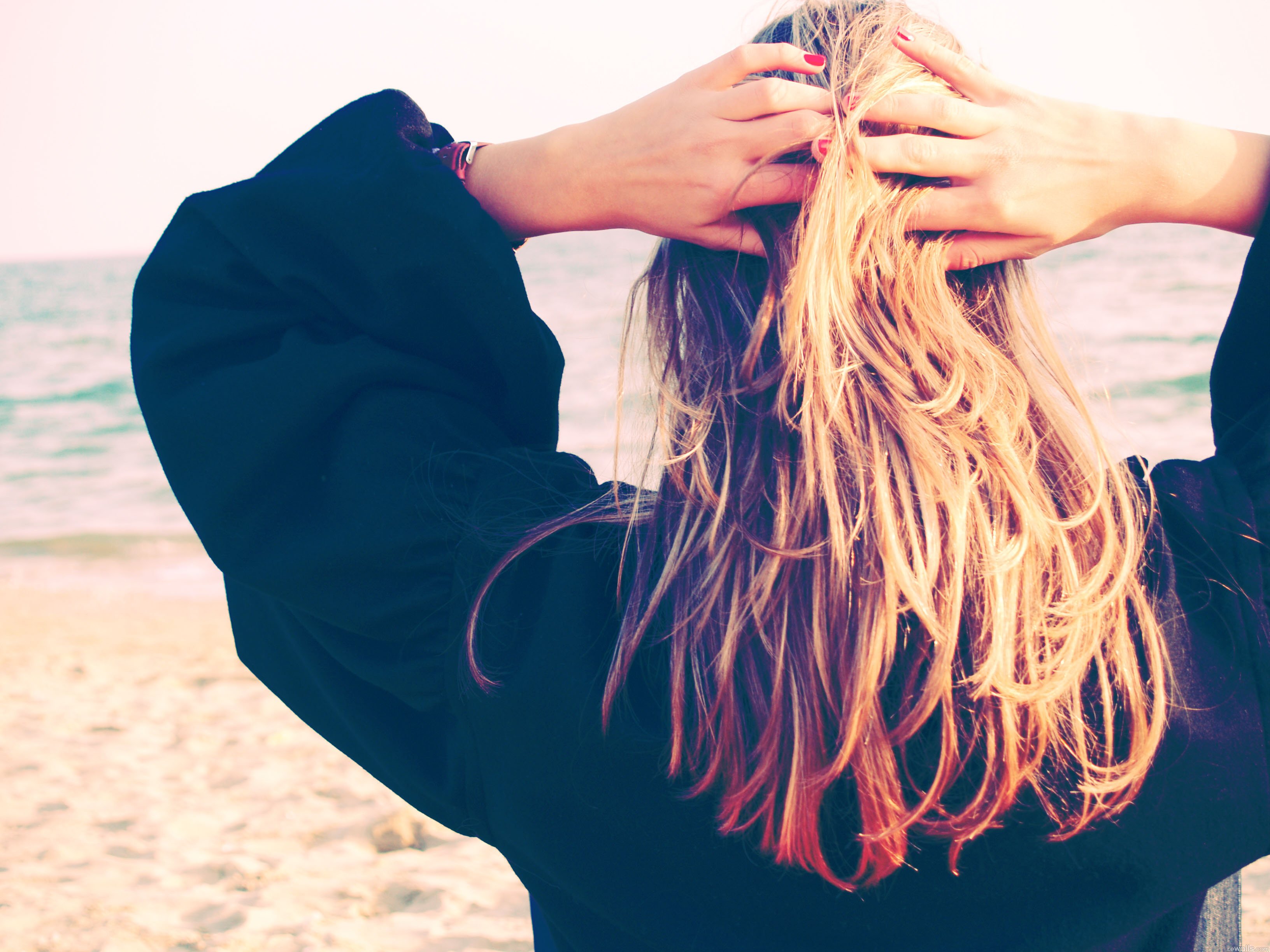 Блондинка с длинными волосами на море