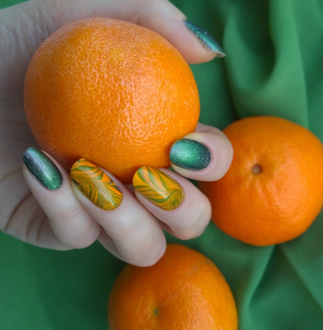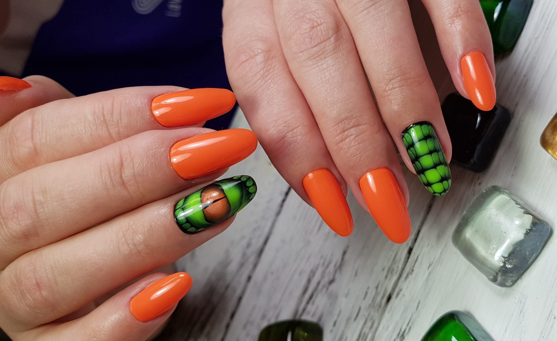 Маникюр оранжевый с зеленым