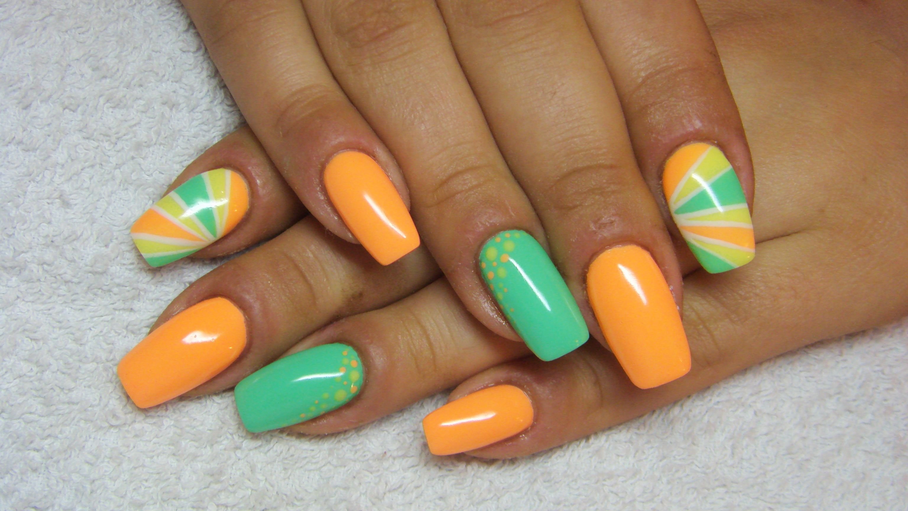 Салатные и оранжевые длинные ногти