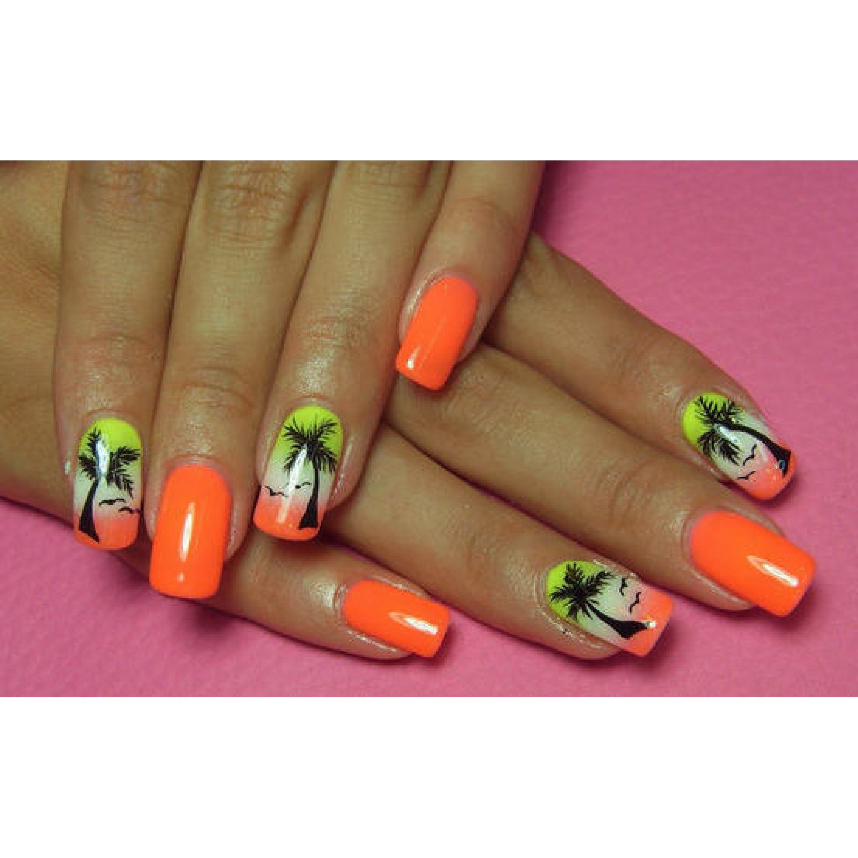 Оранжевый маникюр с пальмами