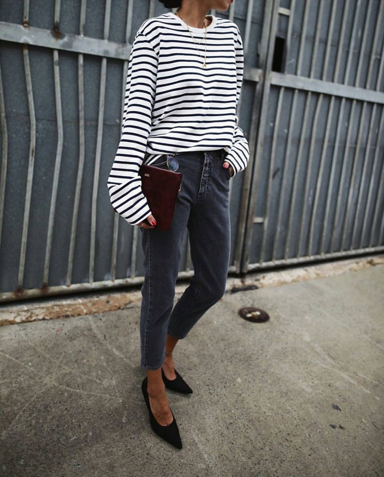 Полосатая кофта и джинсы