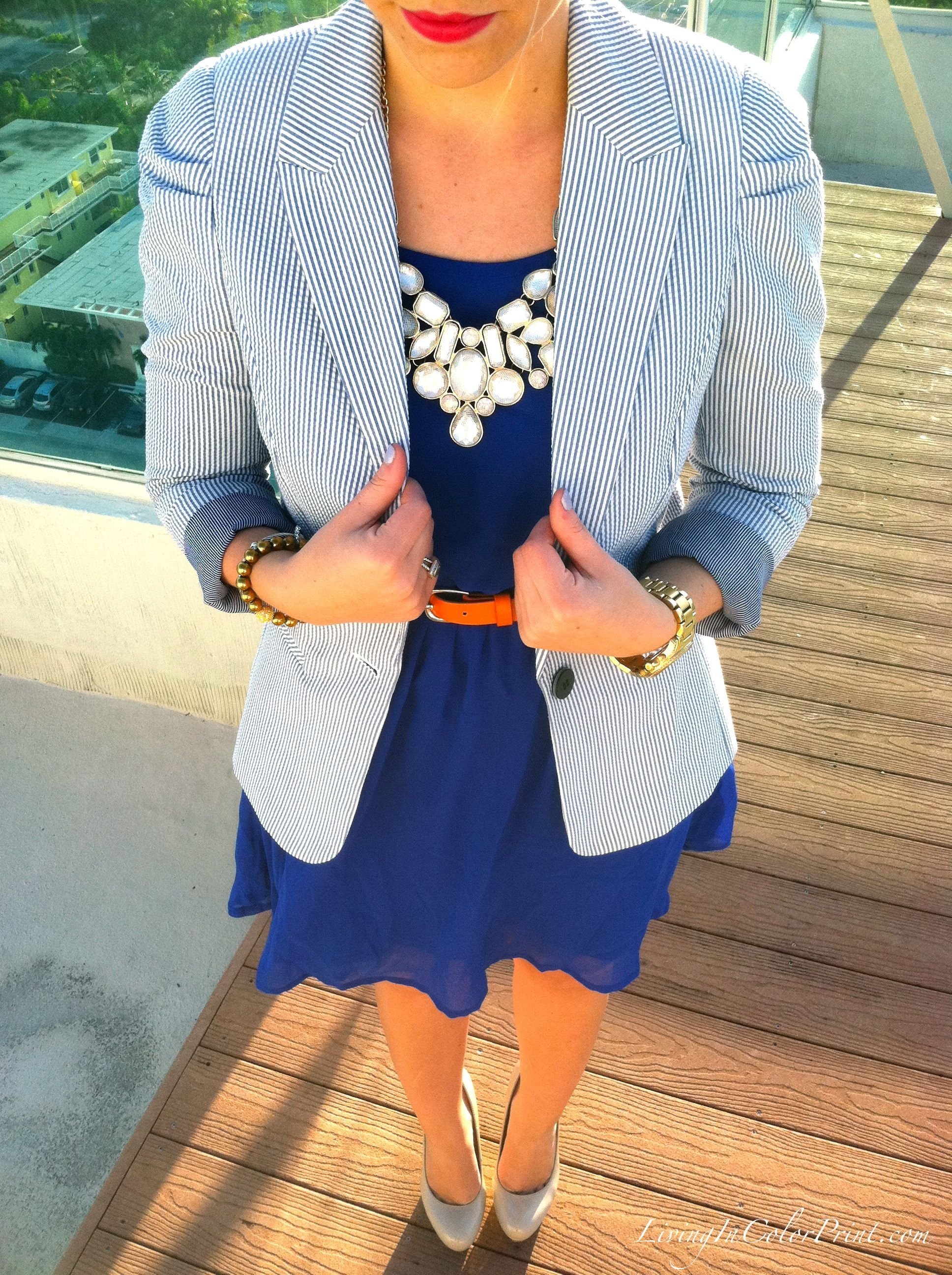 Синее платье с белым пиджаком