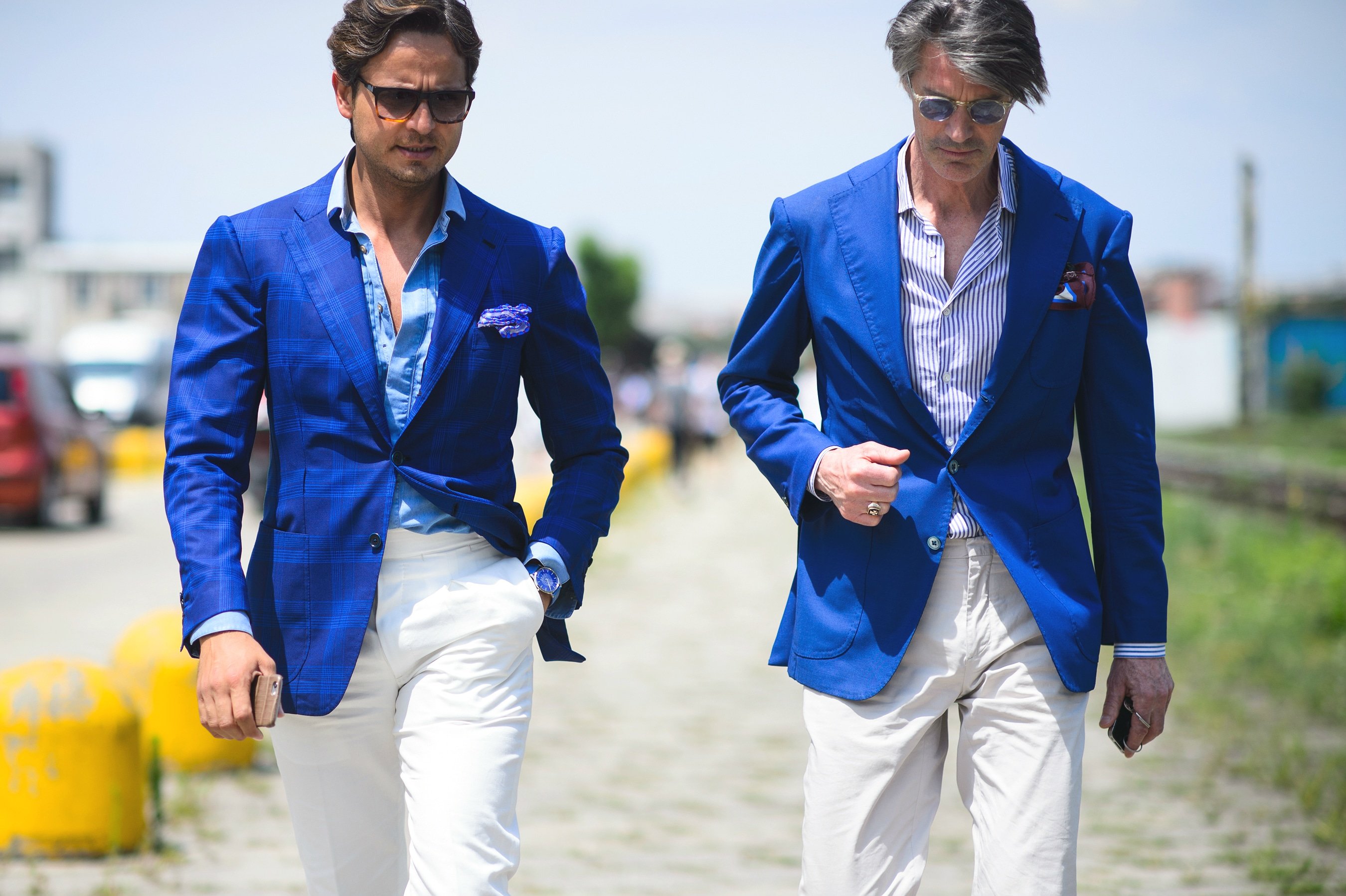 Голубой пиджак и яркие кроссовки