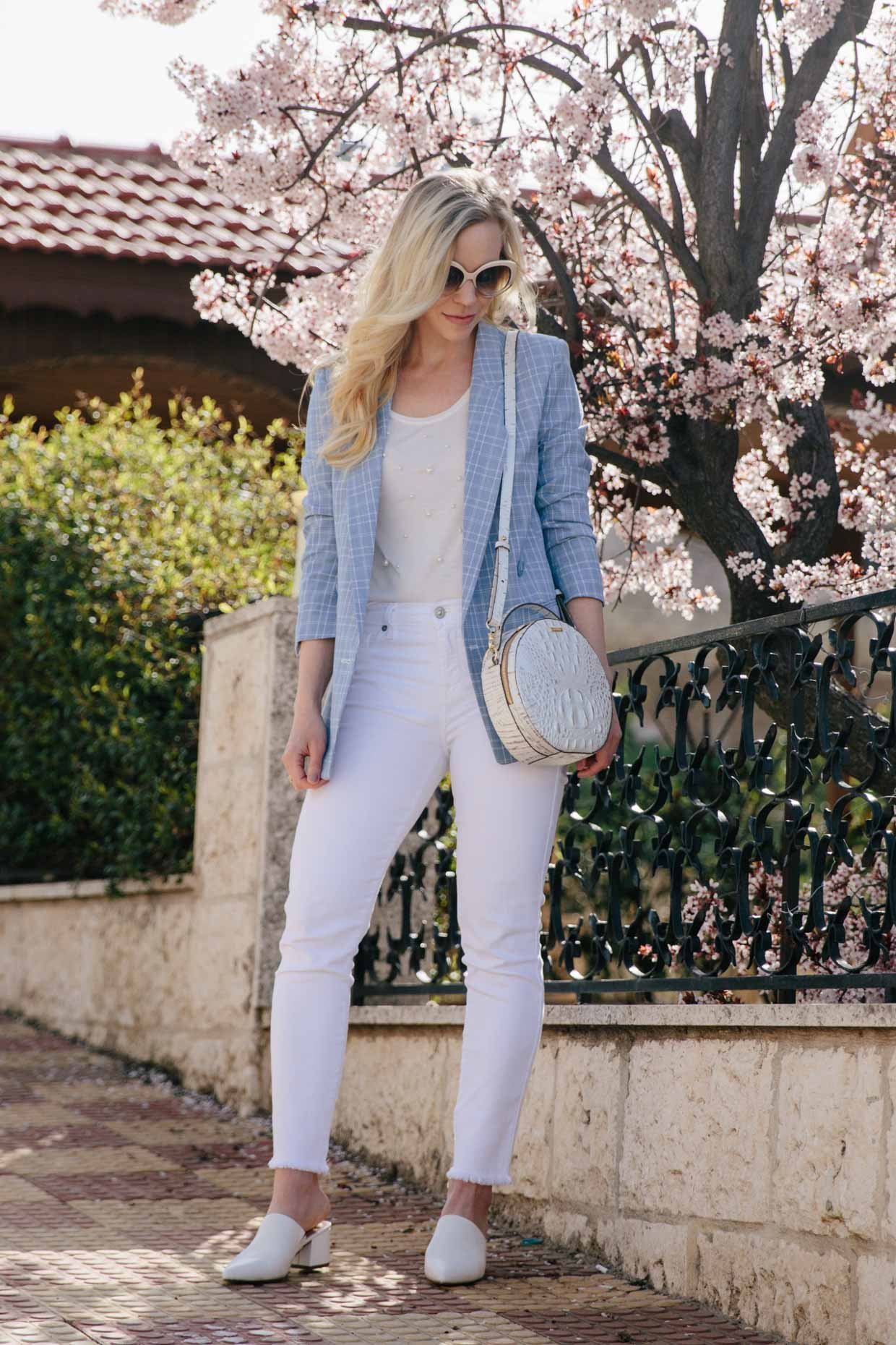 Голубой жакет и белые джинсы