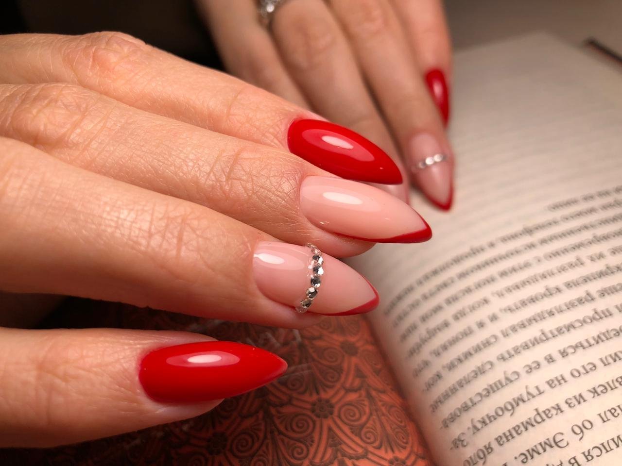Красный френч на миндалевидных ногтях
