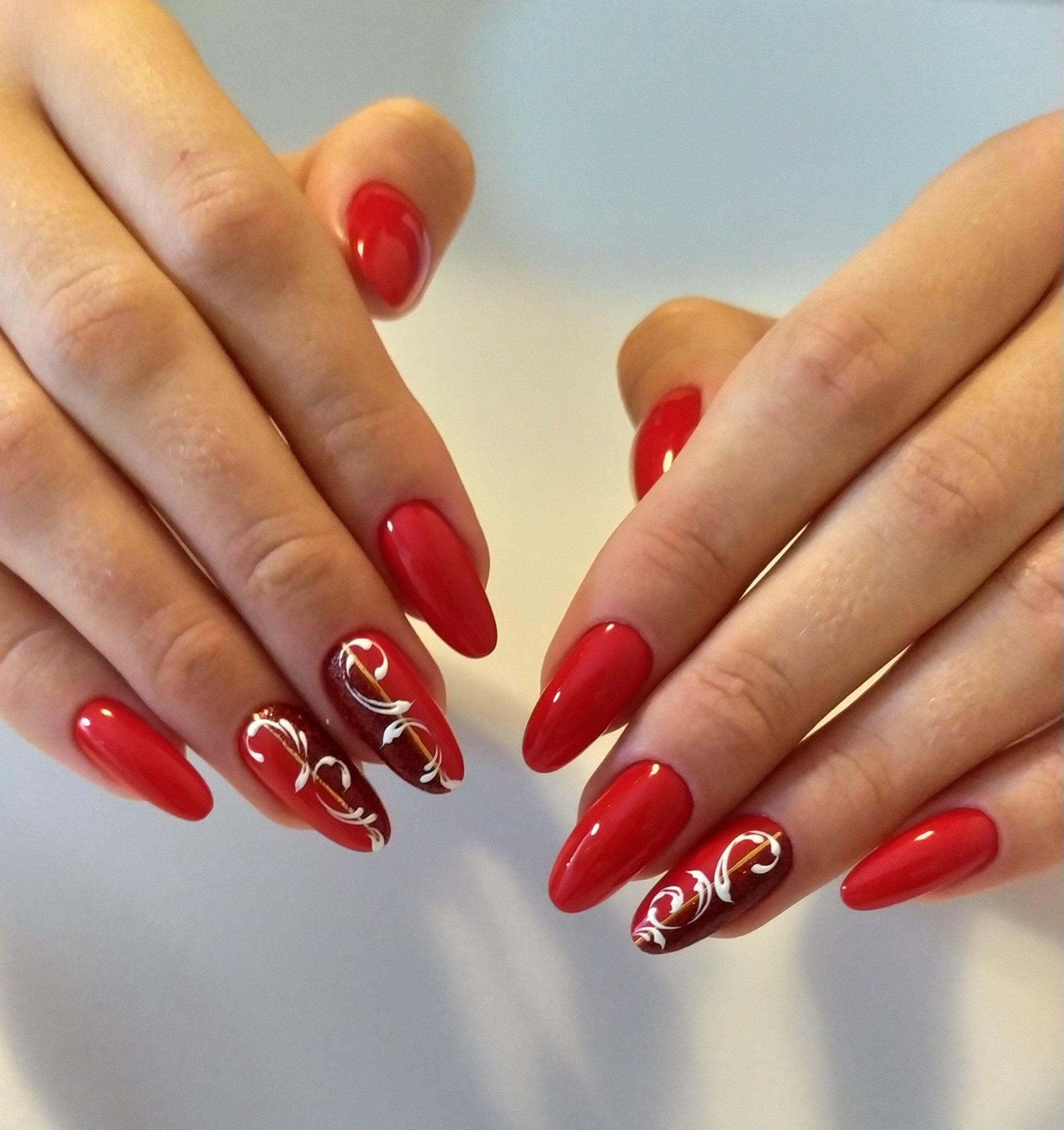 Красный маникюр на миндалевидных ногтях