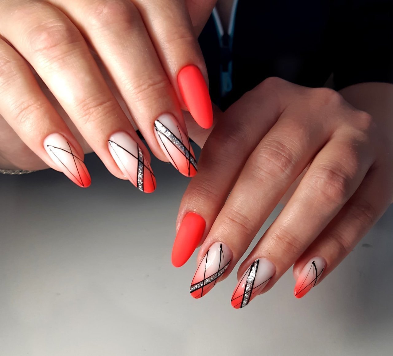 Красный френч с геометрией на миндалевидных ногтях