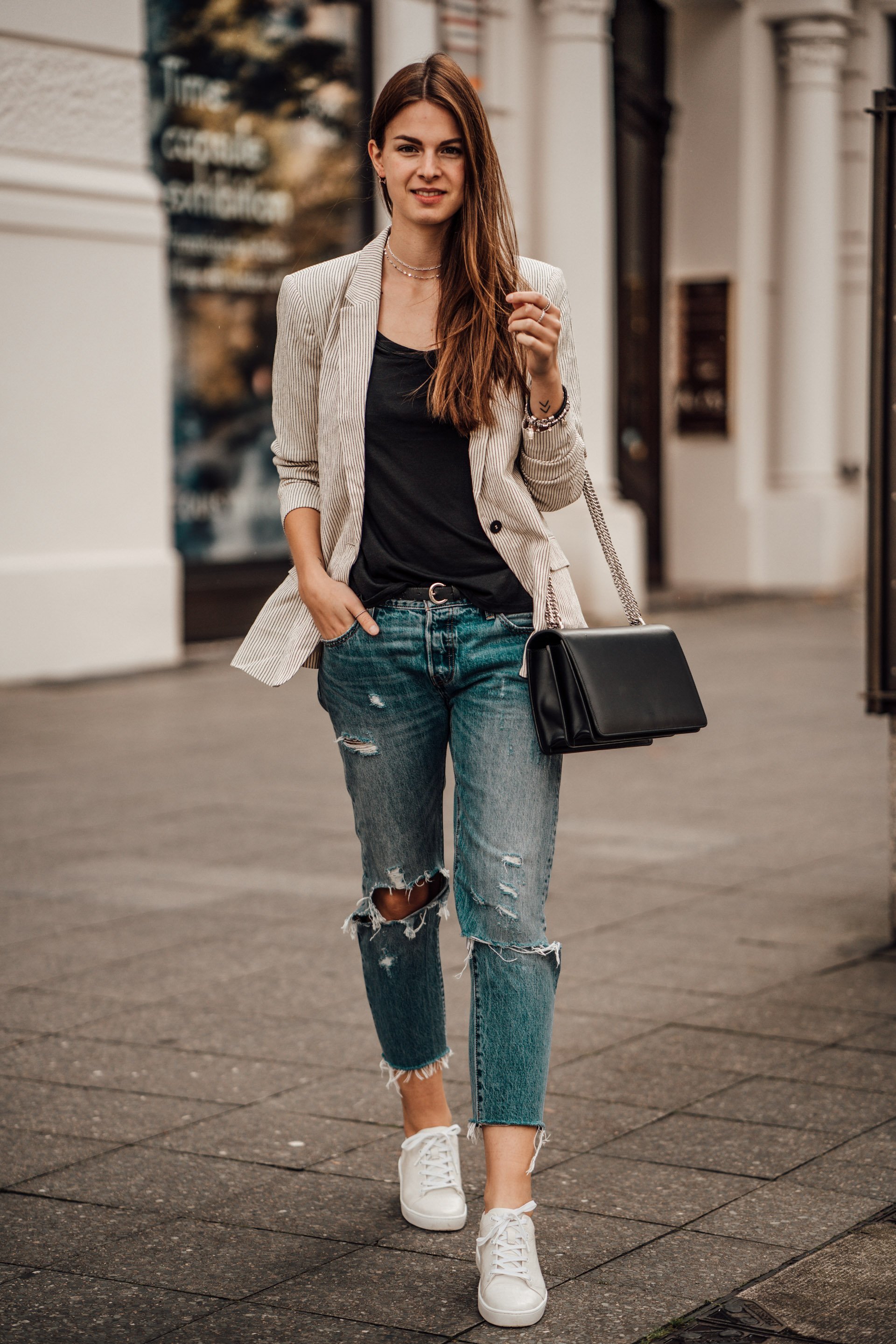 ![Рваные джинсы и блузка]()
