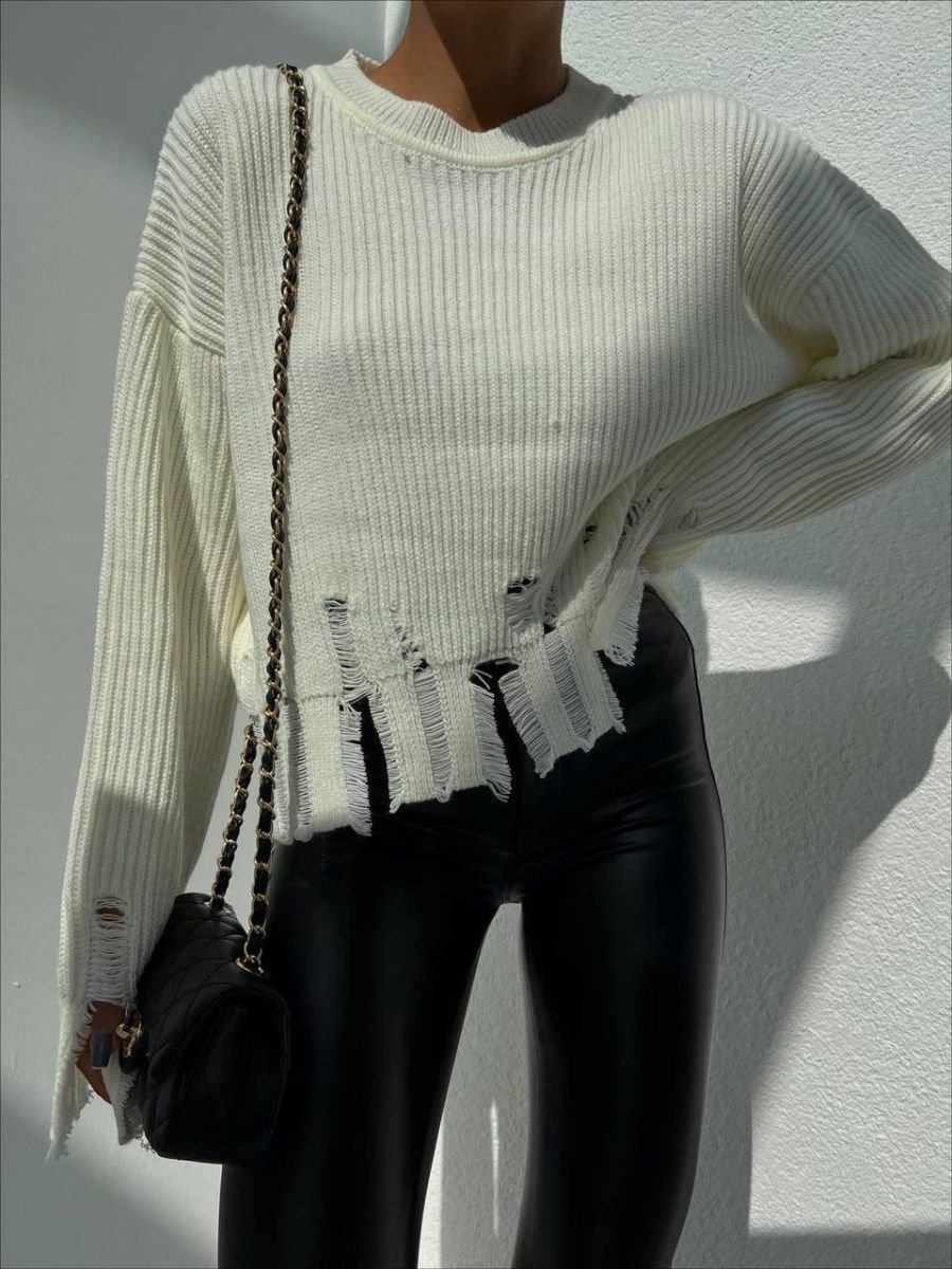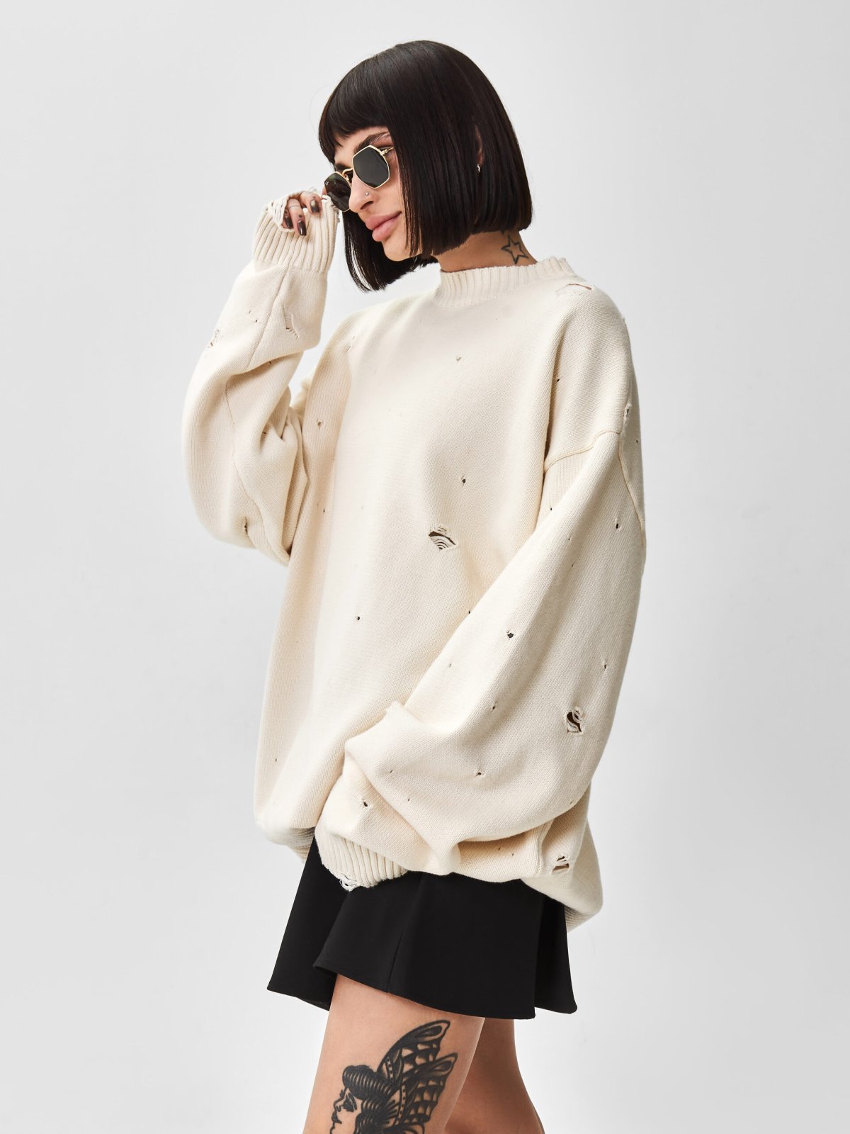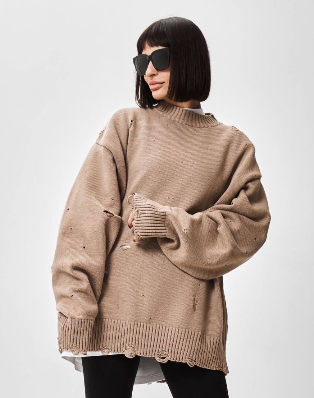 Свитер выполнен в нежных приглушенных тонах, что позволяет ему легко сочетаться с различными элементами гардероба. Рваные детали на свитере придают ему некоторую легкость и игривость, создавая интересный акцент. Кроме того, такой стиль подходит для любых повседневных событий, от прогулок по городу до вечеринок с друзьями.