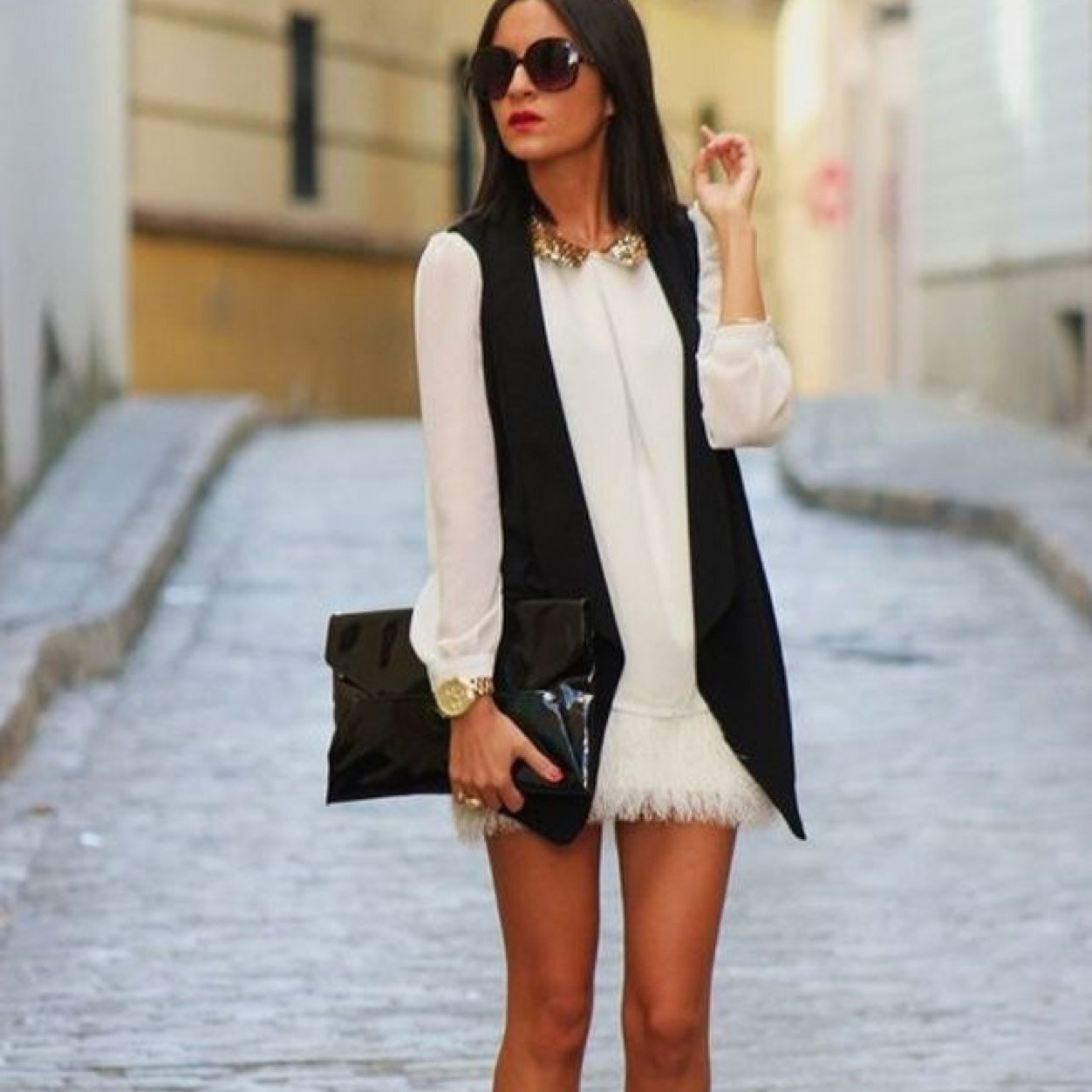 В этом наряде вы будете выглядеть неповторимо и очаровательно. Позвольте себе раскрыть вашу красоту с помощью чёрного платья с белым пиджаком и завоевать все сердца вокруг вас!