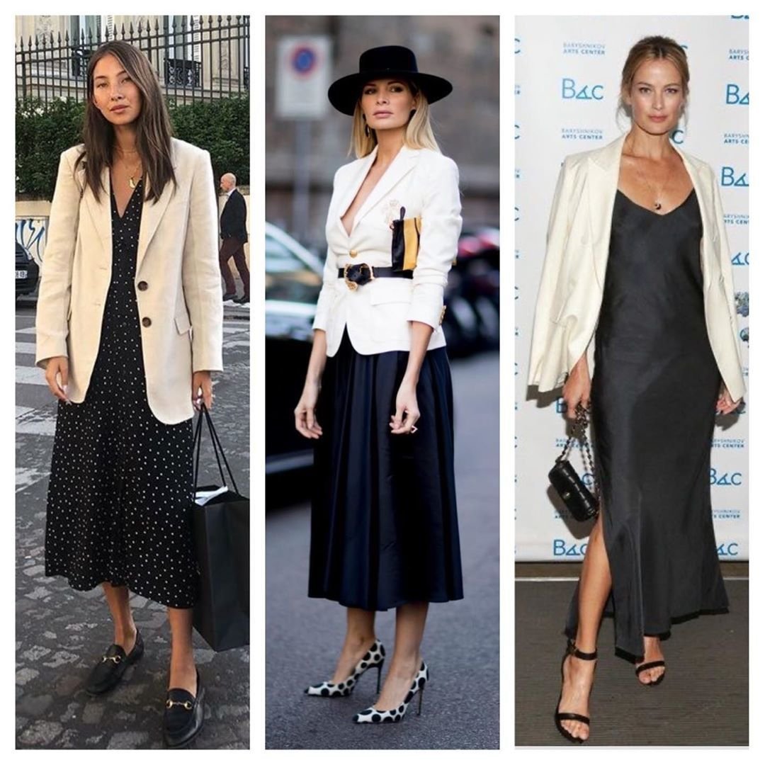 Этот образ подходит для различных мероприятий - от деловой встречи до романтического свидания. Чёрное платье с белым пиджаком создают элегантность и шарм, не оставляя равнодушными окружающих.