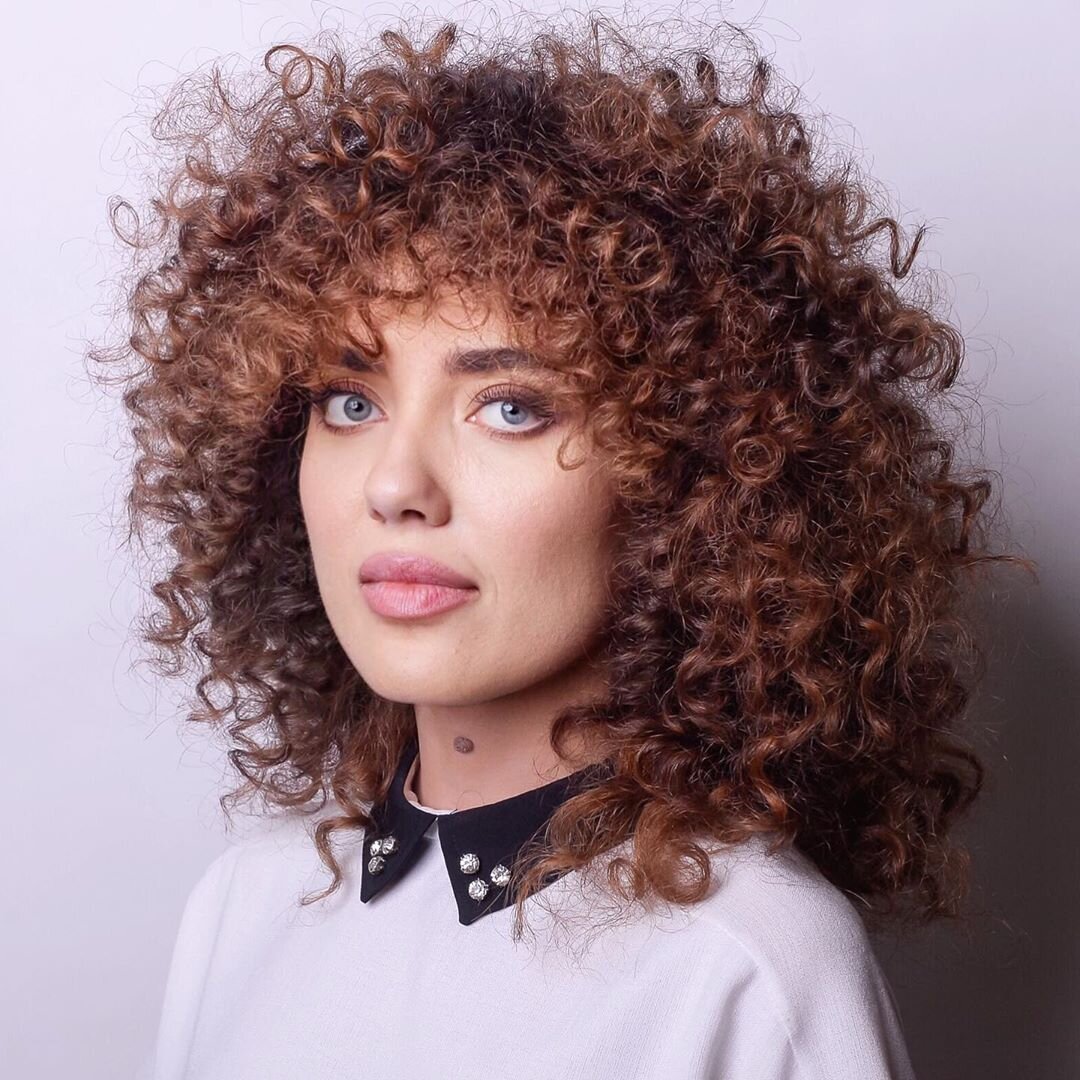 Это фото запечатлевает модную прическу с афро кудрями, дополненной стильной прямой челкой. Волосы обладают впечатляющим объемом и текстурой, создавая ощущение естественной густоты. Афро кудри придают образу неповторимую экзотичность и свежесть, подчеркивая индивидуальность и стиль своей обладательницы.