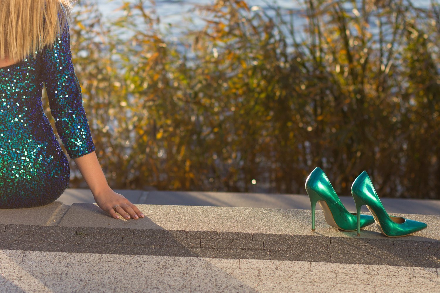 Чёрное платье и зелёные туфли
