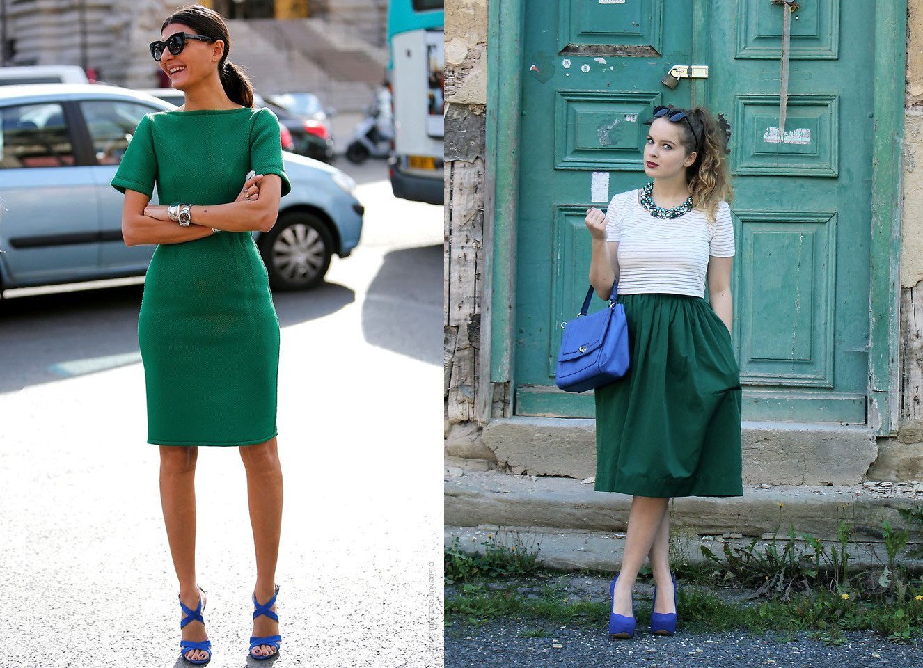 ![Черное платье с зелеными туфлями]()