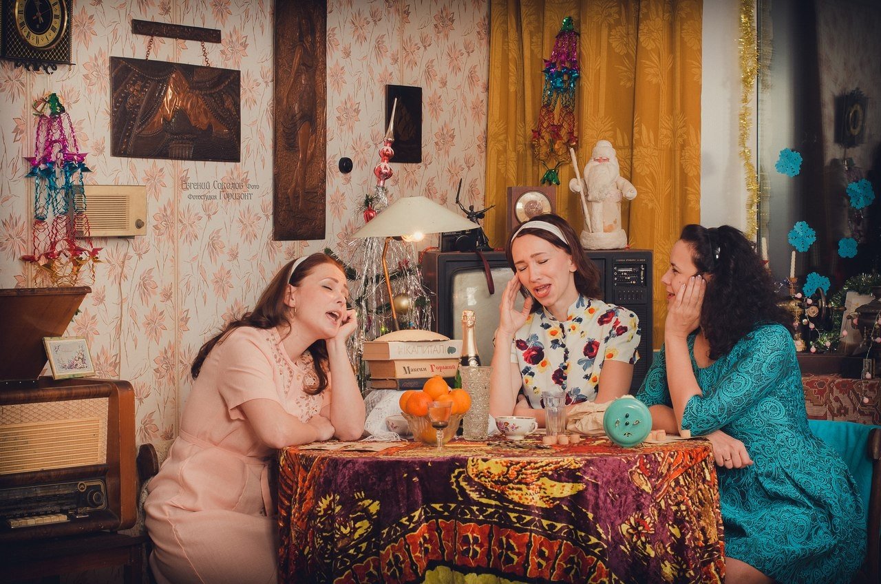 Фотозона представляет собой настоящий калейдоскоп стилизованных декораций и атрибутов. Она выполнена в классическом советском стиле, чтобы передать ощущение того, как праздновали Новый год наши родители и бабушки.