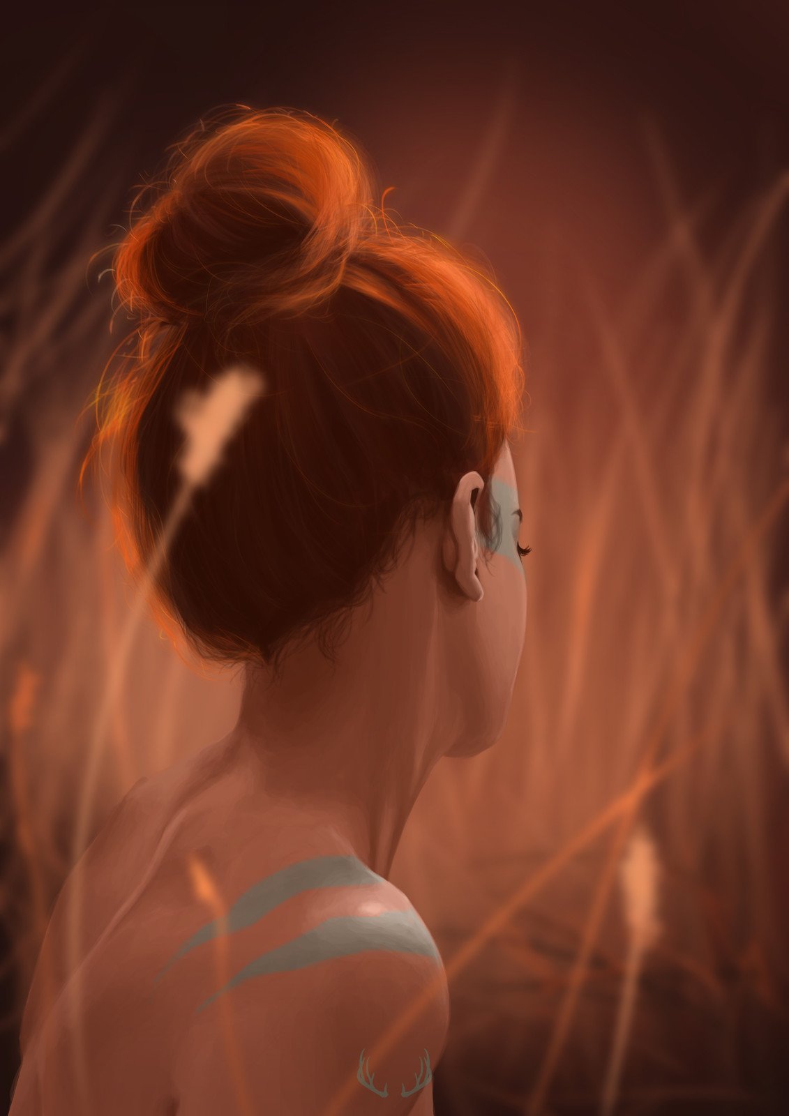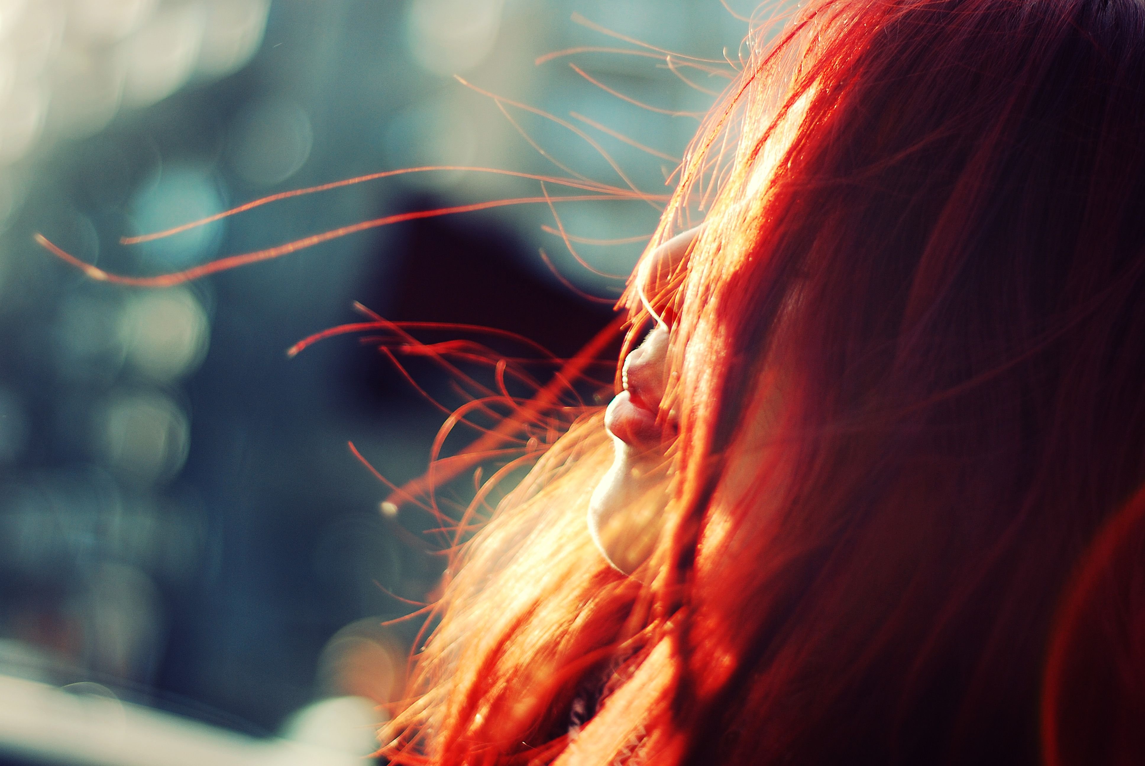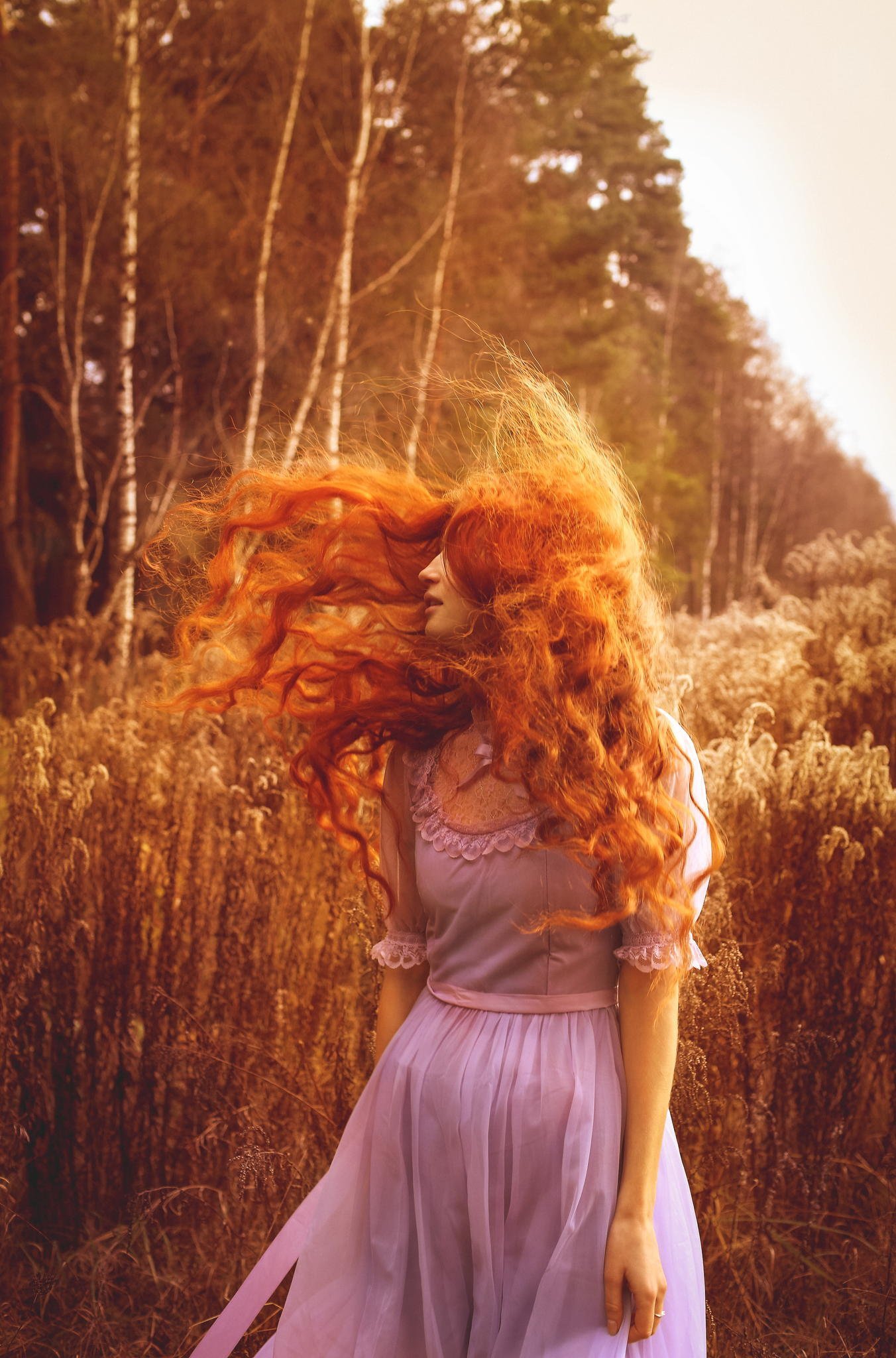 Рыжие волосы всегда ассоциируются с силой характера и страстным нравом. Эти черты прекрасно переданы на данном снимке. Девушка смотрит вдаль, словно готова преодолеть любые преграды на своем пути и осуществить свои мечты. Ее глаза сияют, будто они отражают огонь искренности и внутренней страсти.