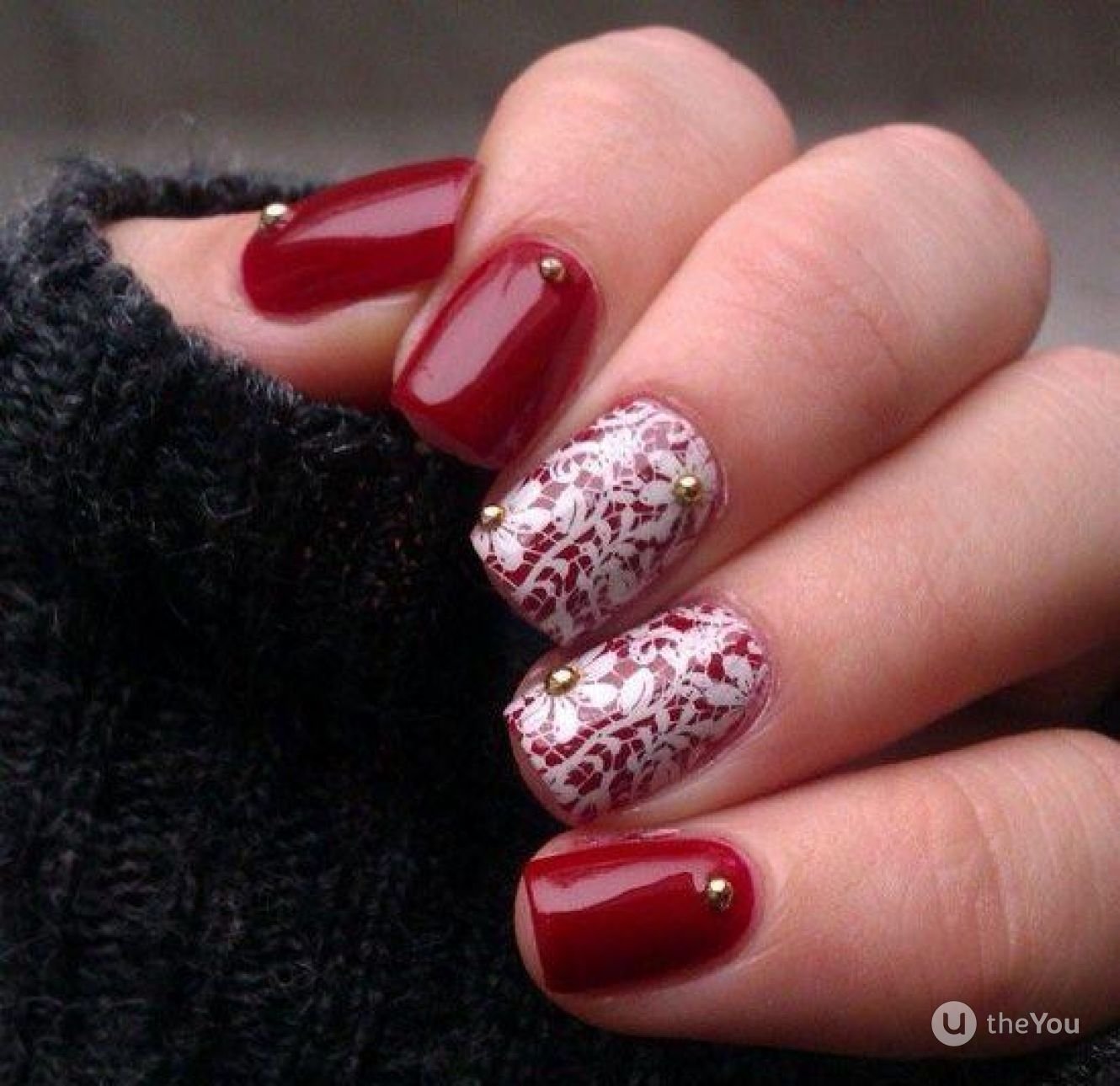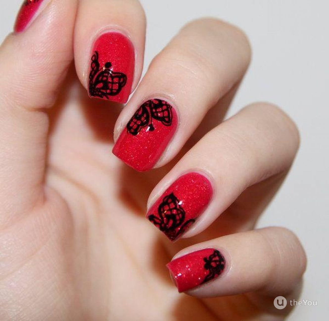 ![Красный маникюр с чёрными кружевами]()