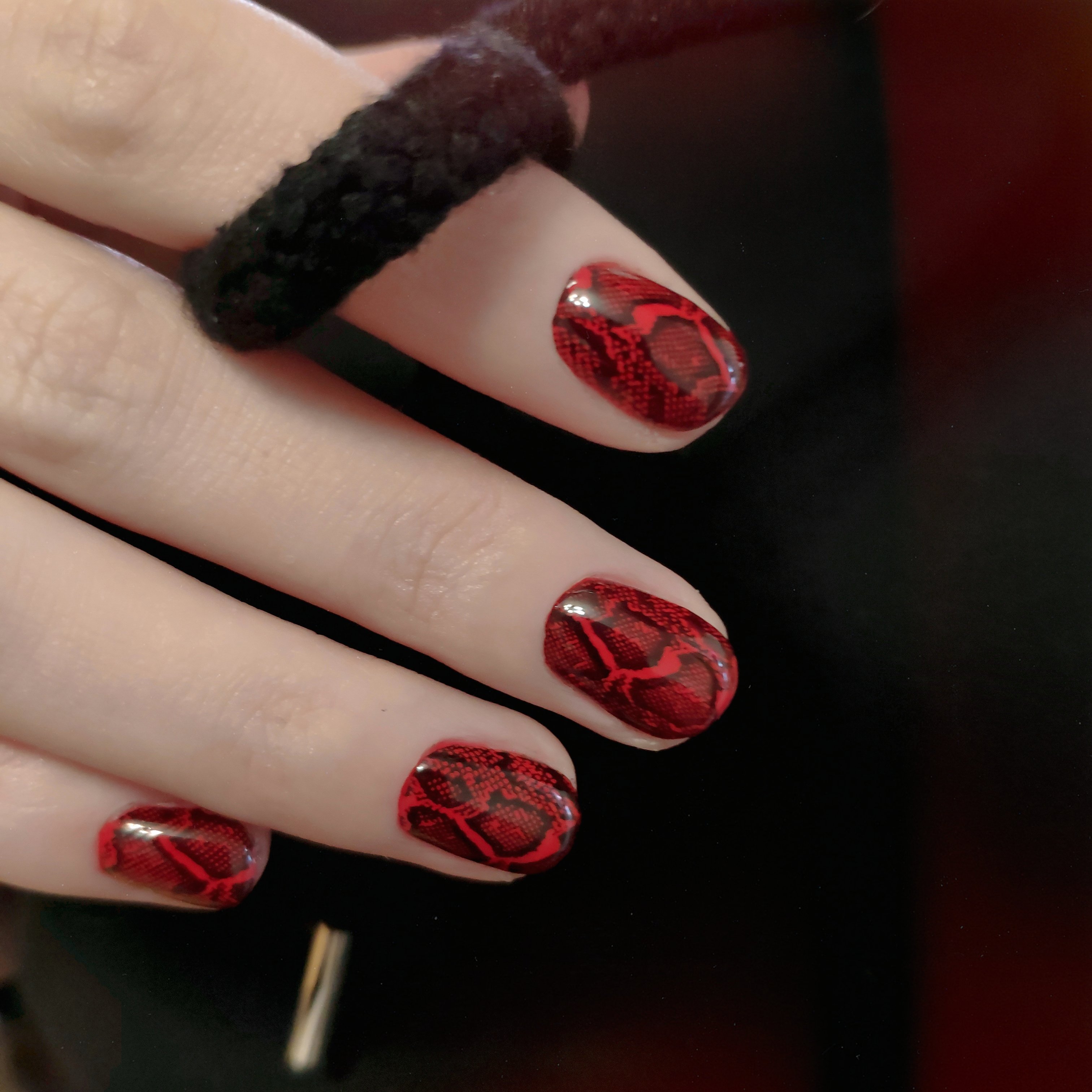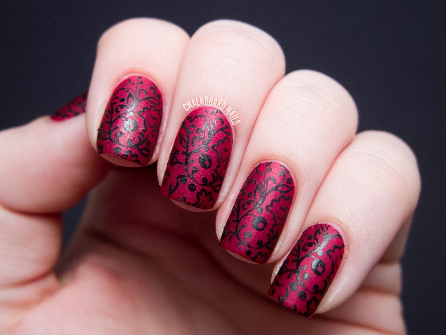 Чёрный стемпинг на красных ногтях