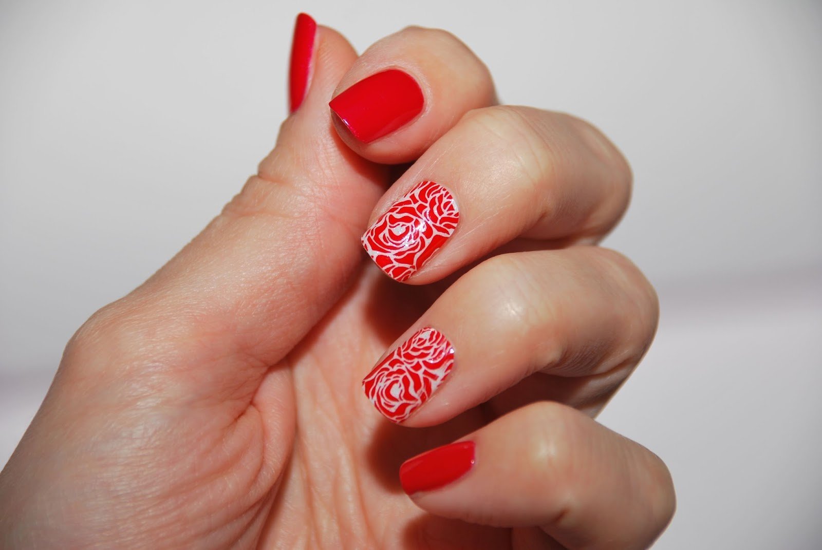 ![Красный лак на ногтях со стемпингом]()