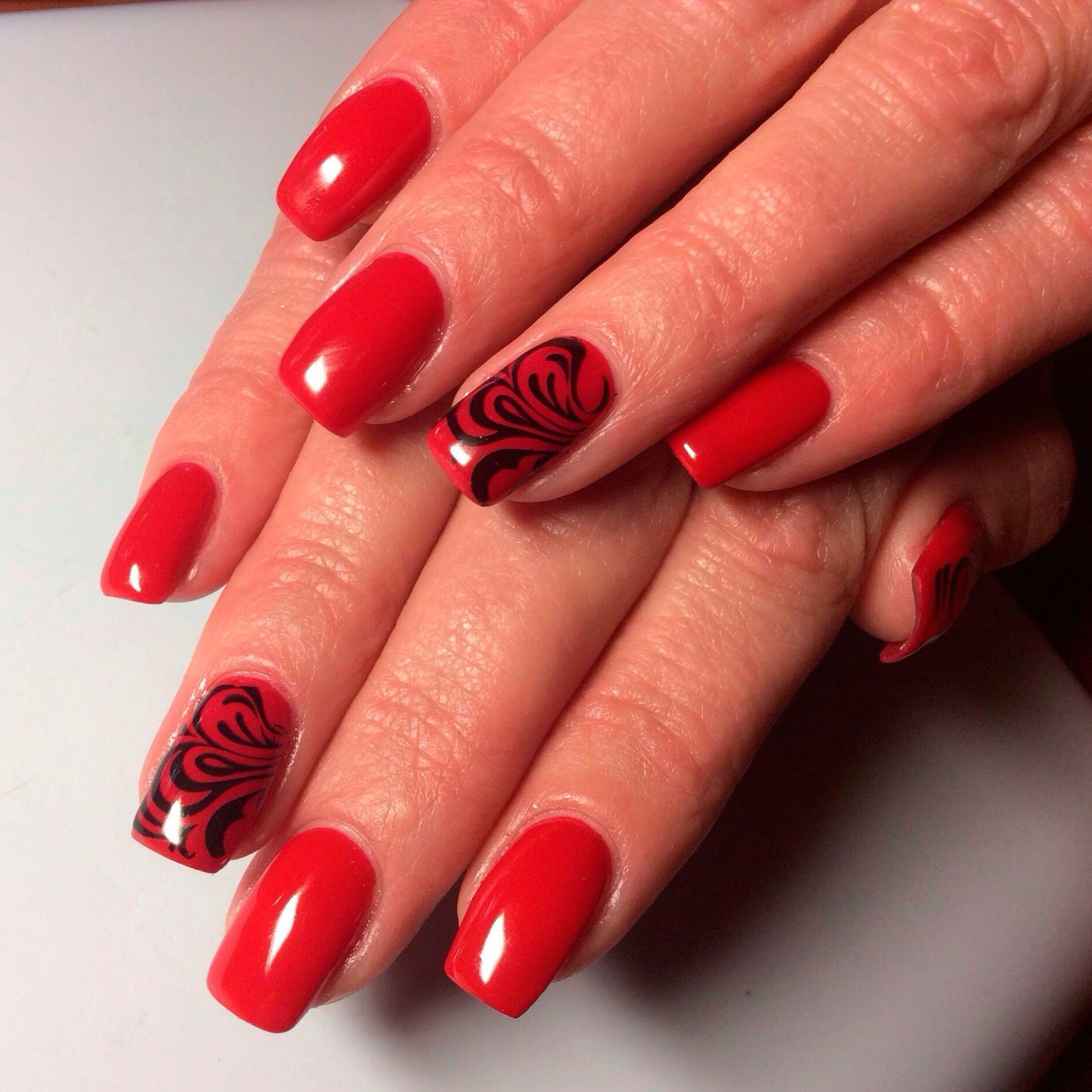 ![Красный маникюр с черным стемпингом]()