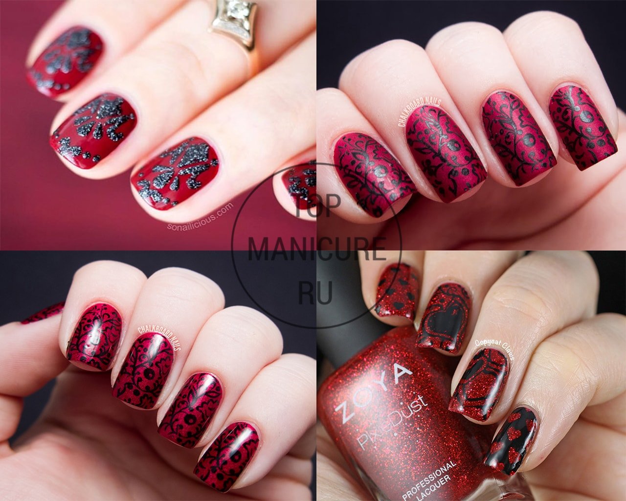 ![Маникюр стемпинг красный красный с черным]()