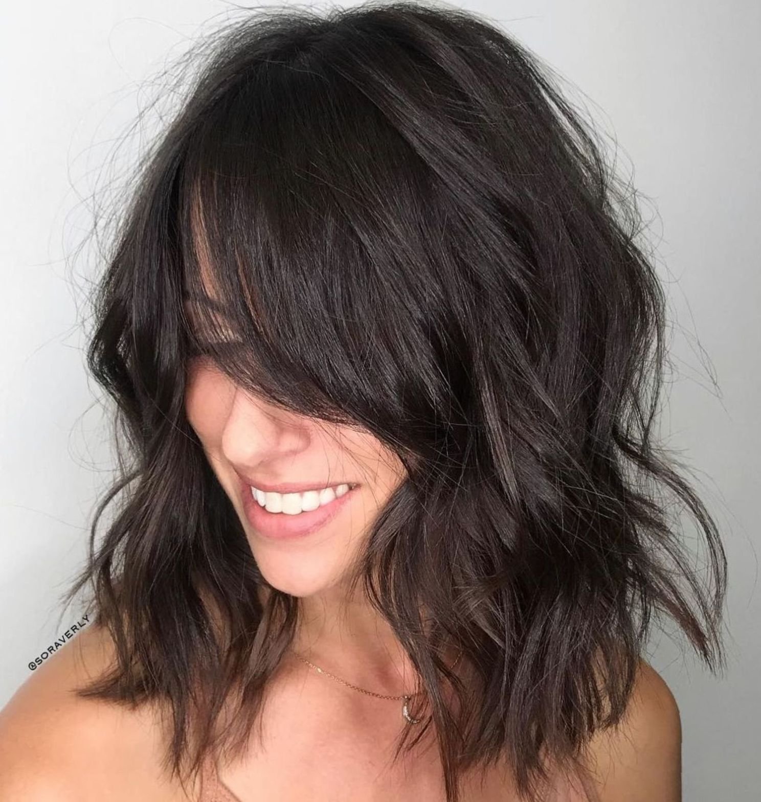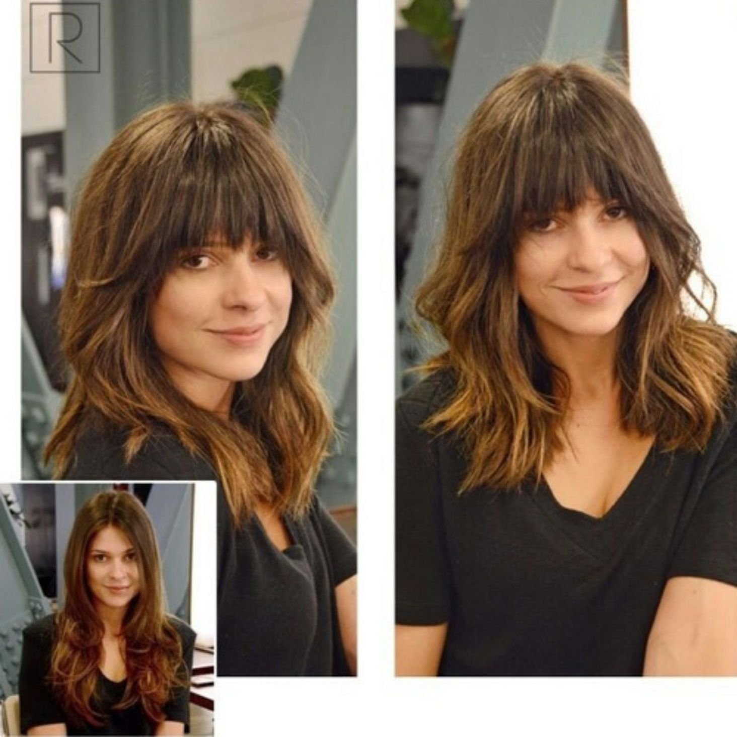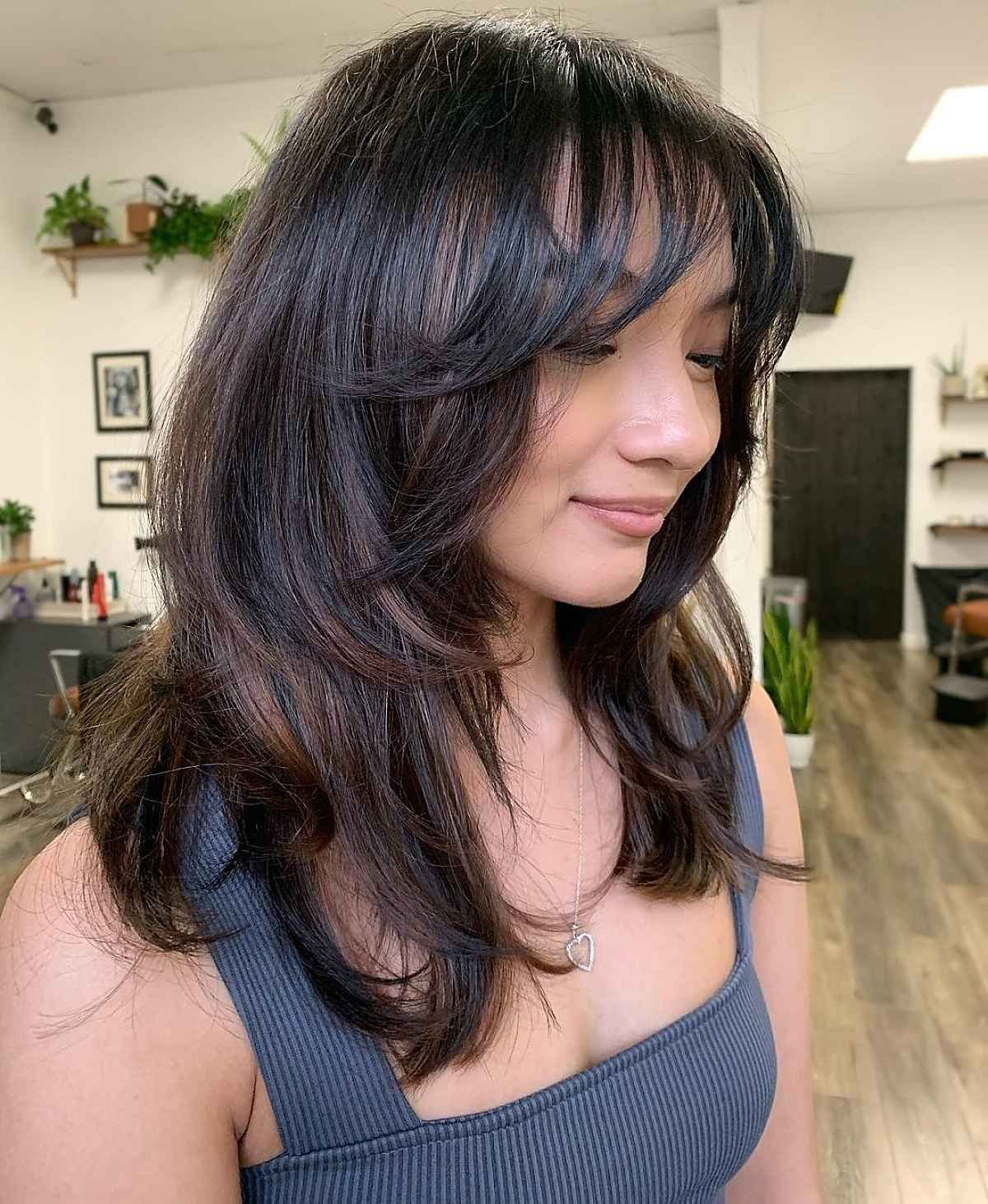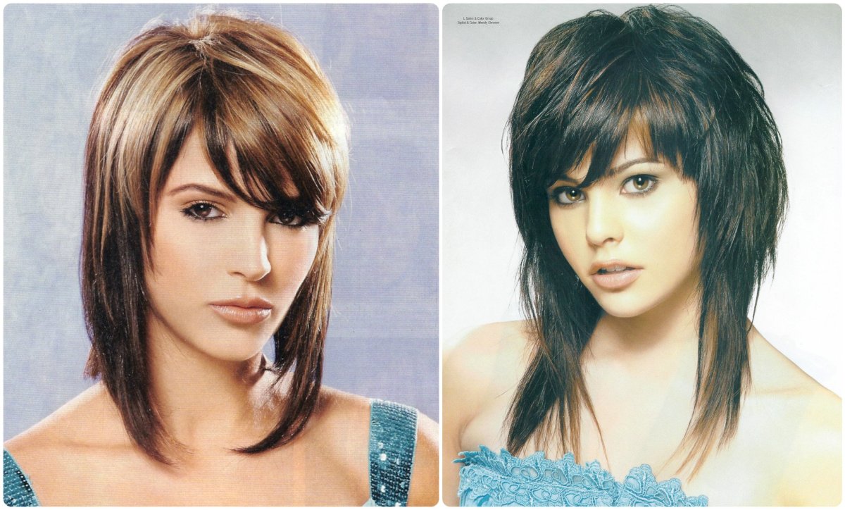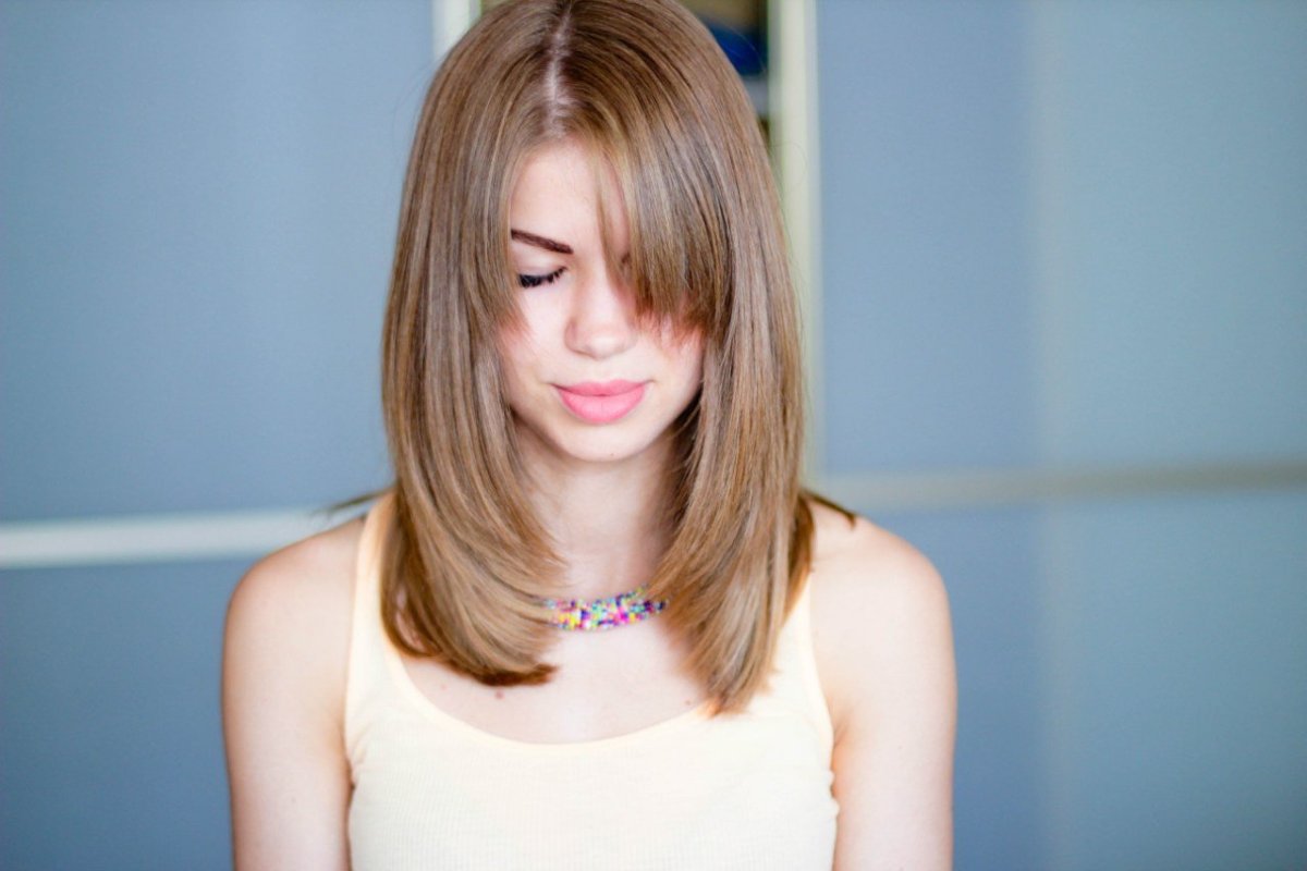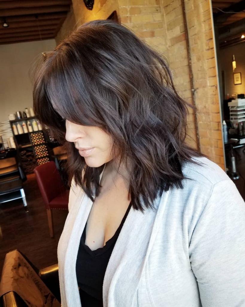 Лесенка на средние волосы с челкой шторкой