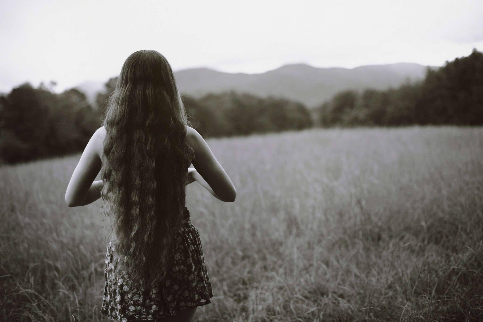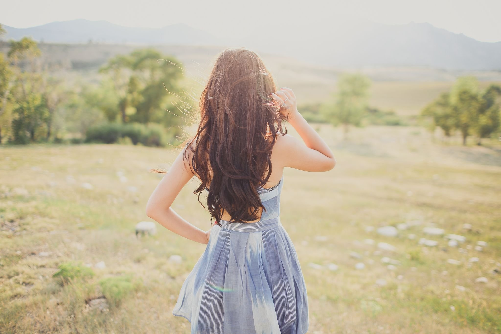 Девушка сзади в платье с длинными волосами