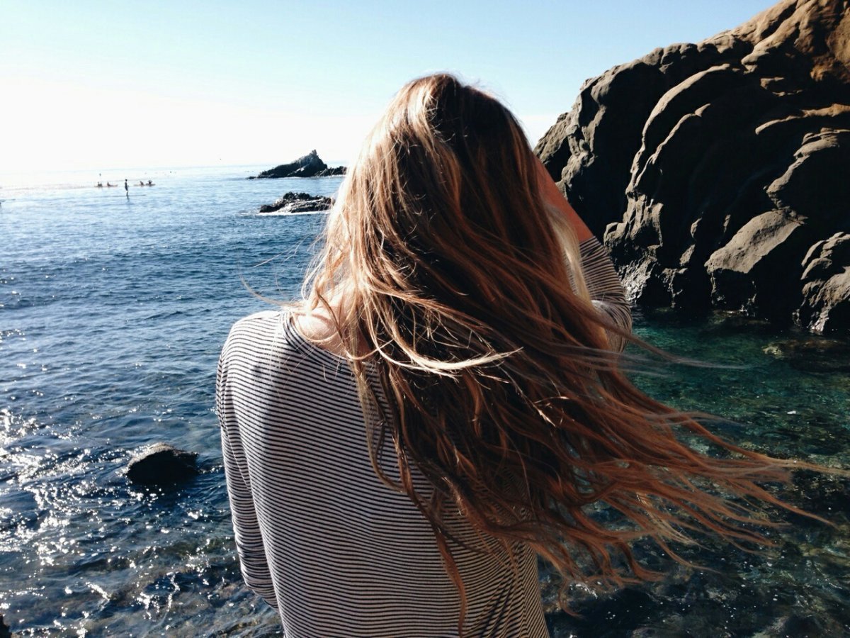 ![Девушка с мелированными волосами со спины на море]()