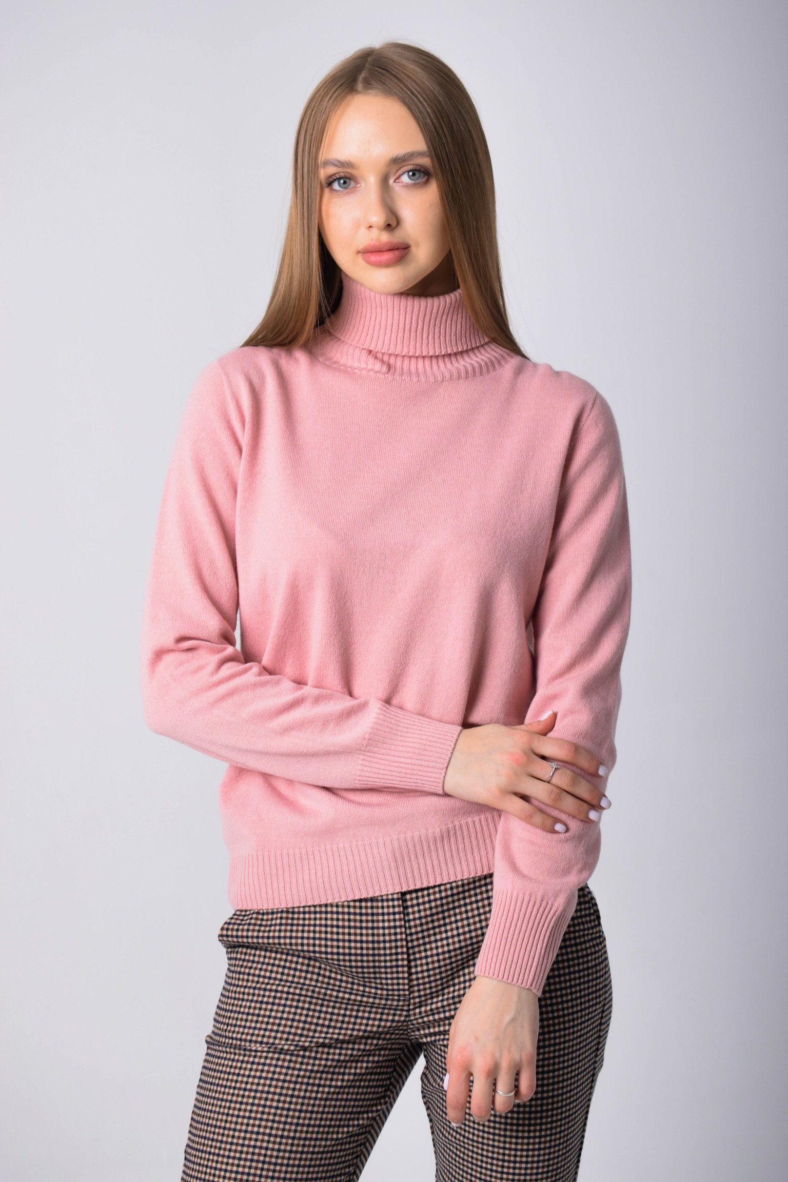 Розовая водолазка нежно облегает ее тонкую талию и подчеркивает изящные линии фигуры. Цвет этой вещи привлекает внимание и создает ассоциации с цветущими цветами и нежностью пастельных оттенков. Благодаря такому выбору цвета, девушка выглядит очень женственно и миловидно.