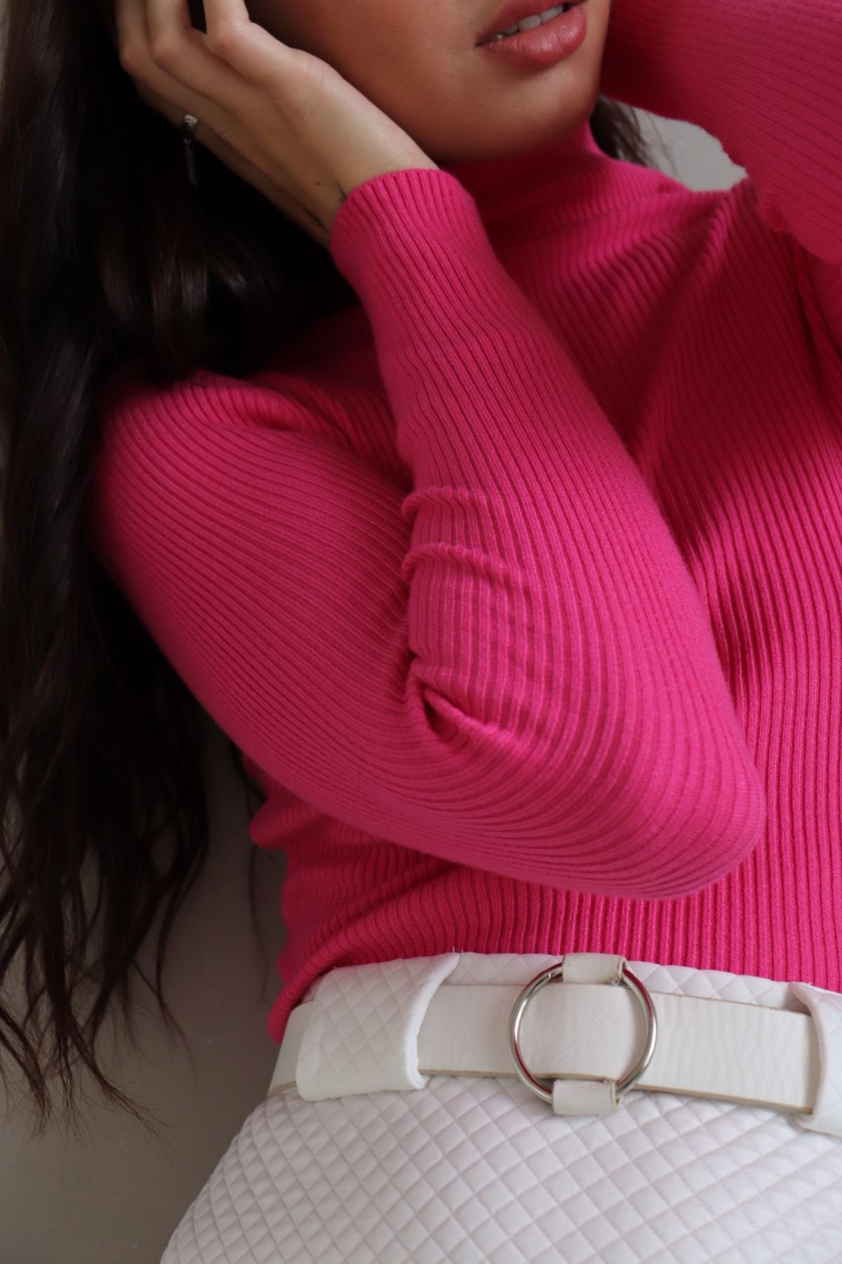 На этой фотографии мы видим образ, который поражает своей яркостью и нежностью. Молодая девушка в розовой водолазке выглядит просто восхитительно! Она словно олицетворение весны, свежести и радости.