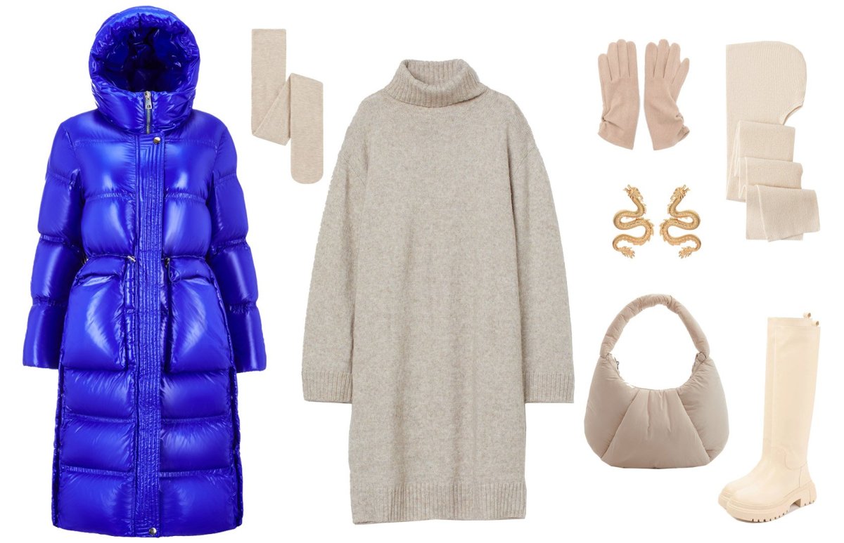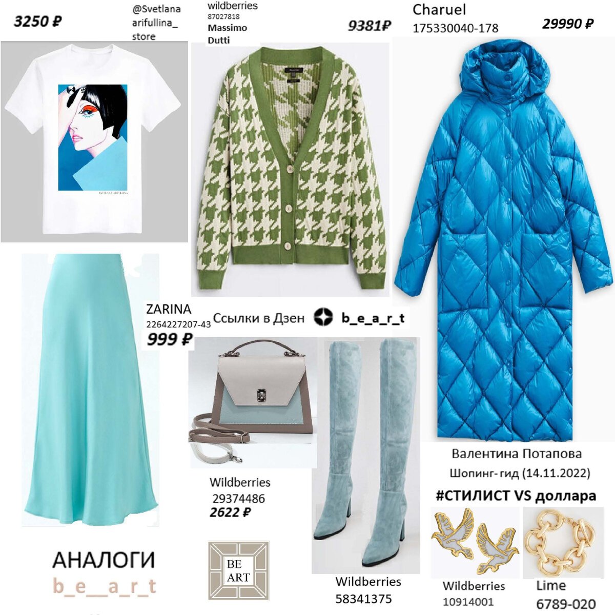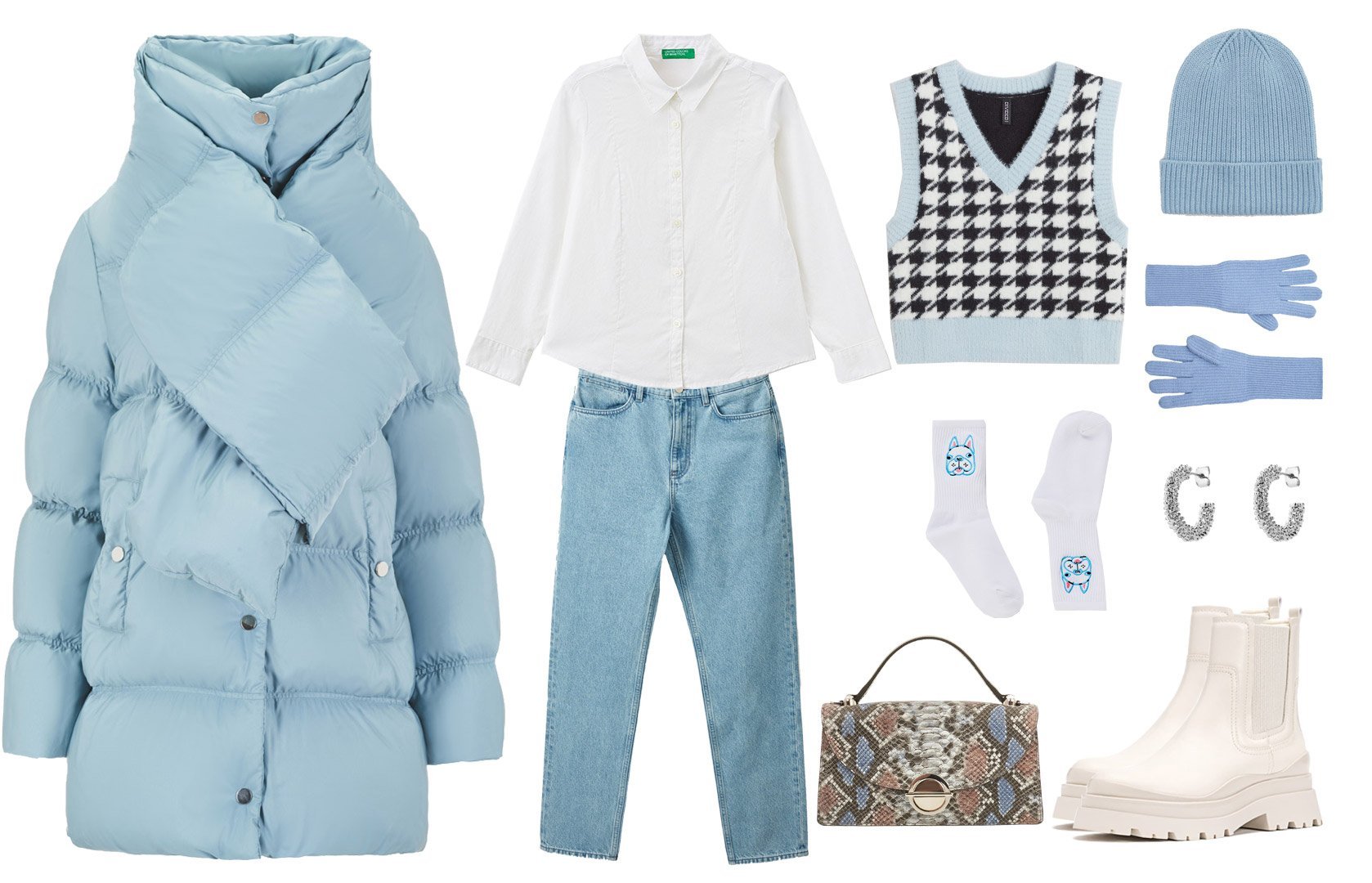 Первый образ - это яркая и энергичная композиция, в которой голубой пуховик сочетается с черной мини-юбкой и белой футболкой. Этот образ идеально подходит для активных девушек, которые всегда в движении и не боятся выделяться из толпы.