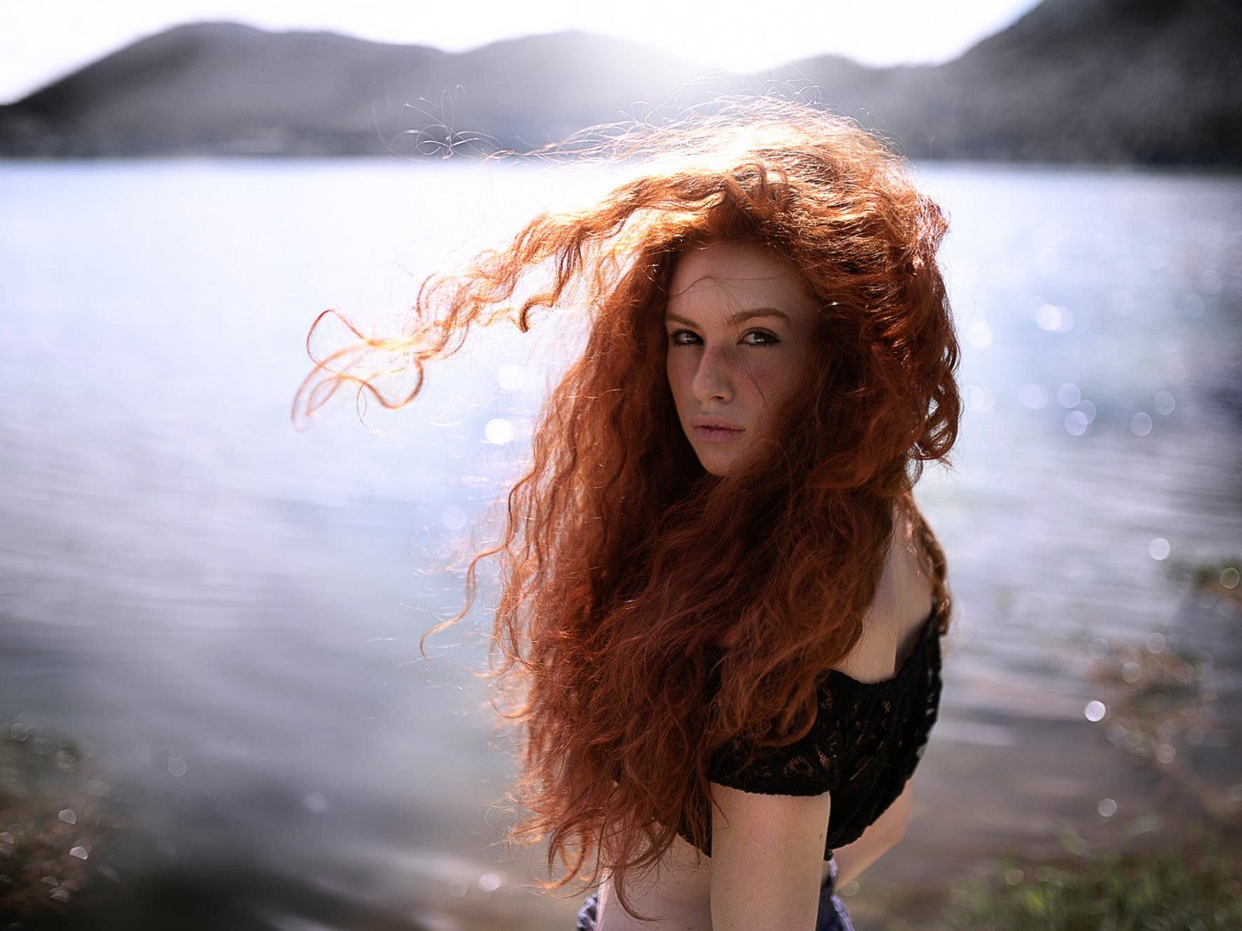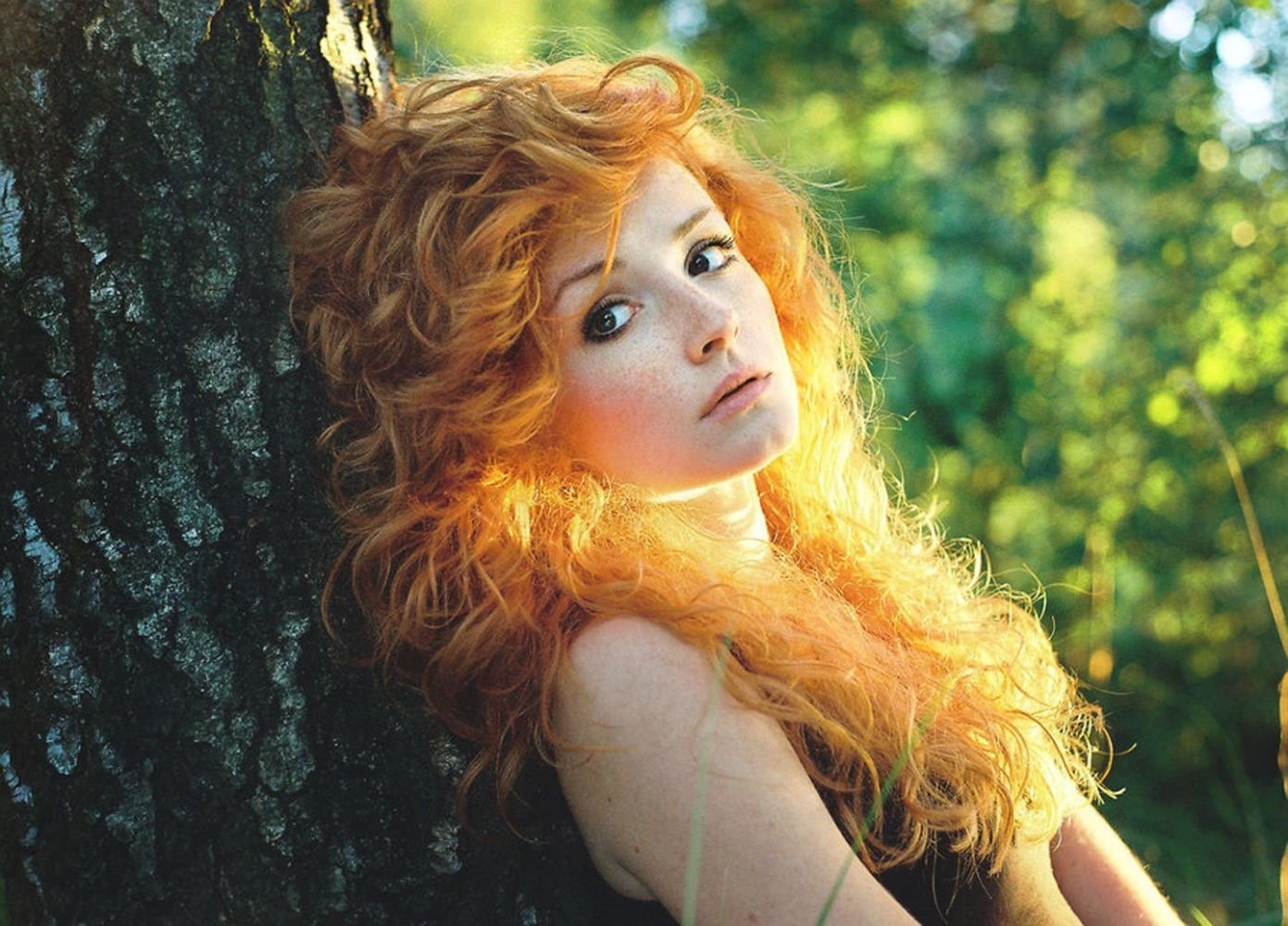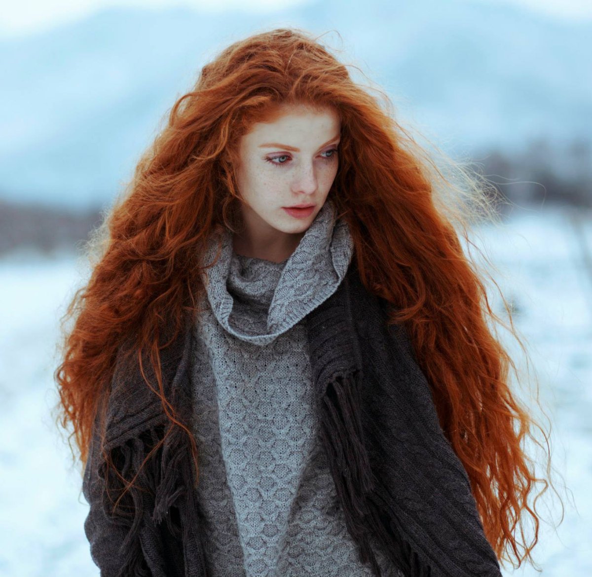 На этой прекрасной фотографии мы видим невероятно очаровательную девушку, которую можно сравнить с настоящей принцессой. Ее густые, роскошные волосы напоминают цвет яркого, огненного заката. Они кажутся такими мягкими и нежными, будто прикасаешься к самому пушистому облаку.