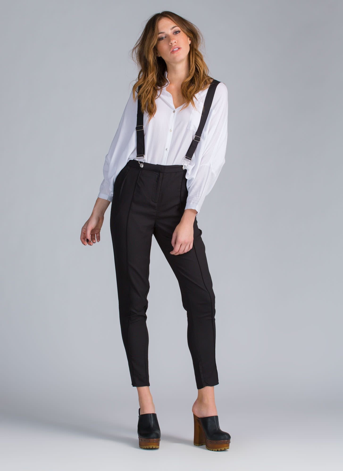Девушка в подтяжках и рубашке