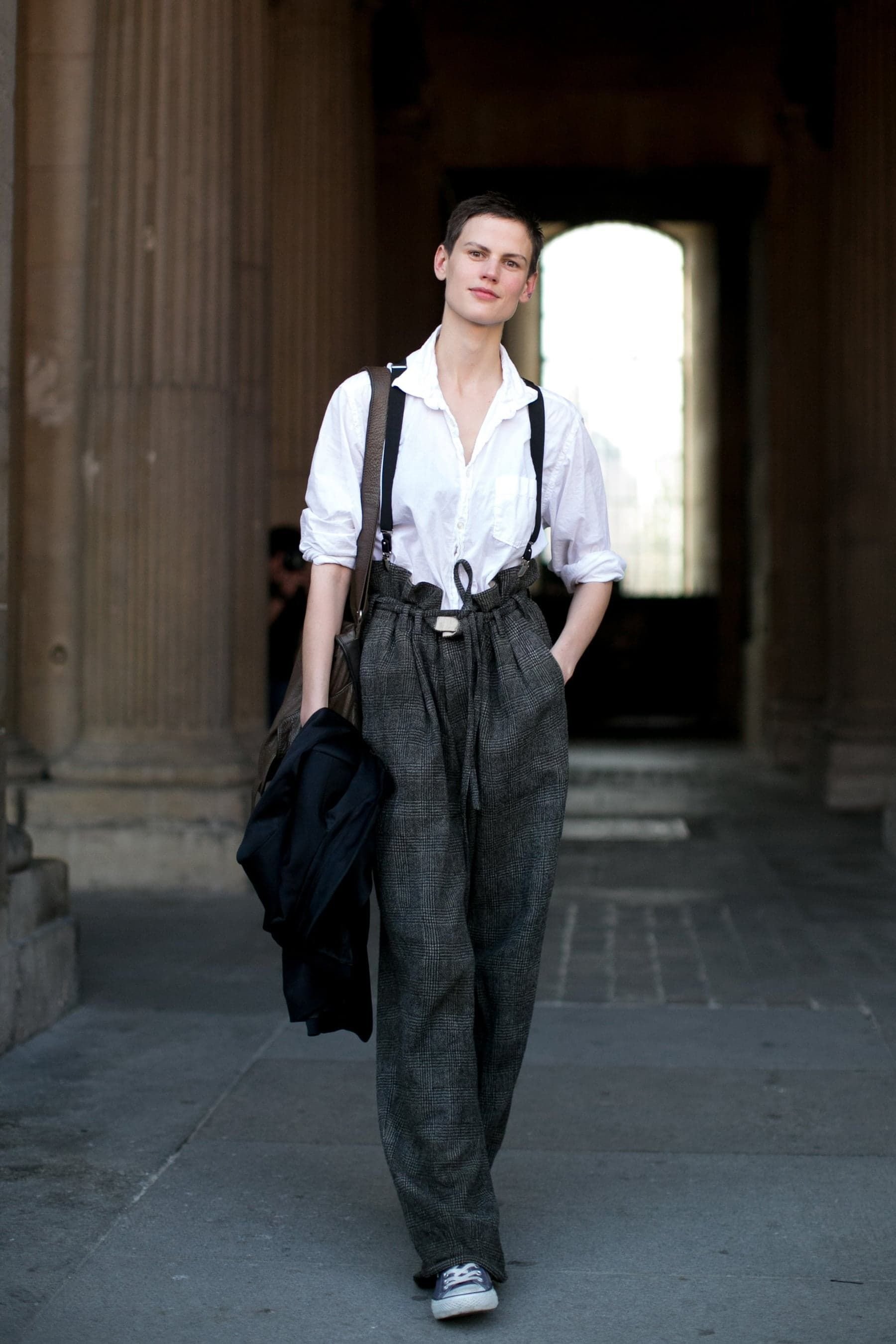 На этой захватывающей фотографии запечатлена изящная молодая женщина в подтяжках и рубашке, создающая образ смелости и стиля. Ее уверенная поза и элегантное выражение лица подчеркивают ее индивидуальность и неповторимость.