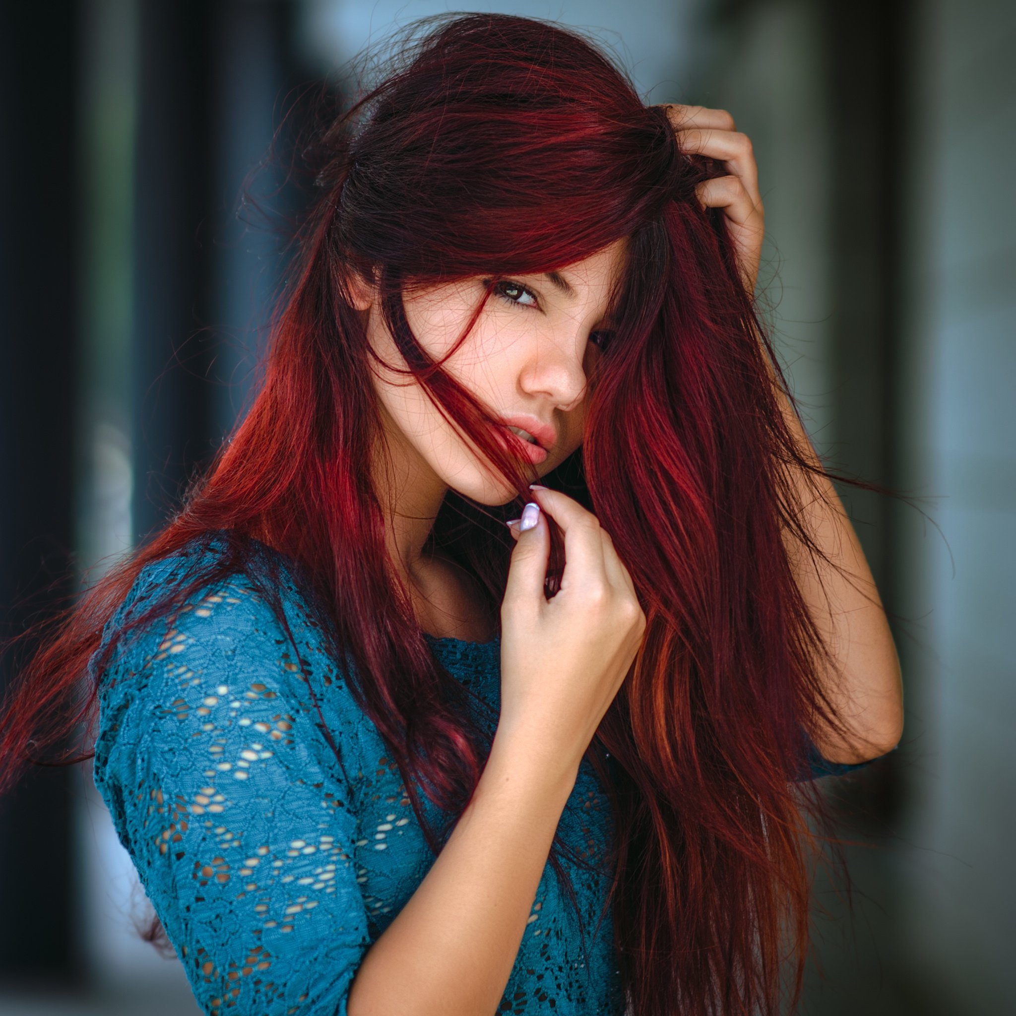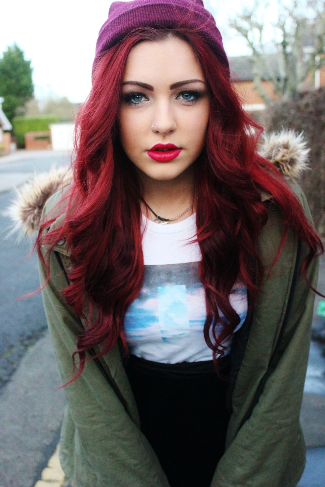 Бордовые волосы и голубые глаза