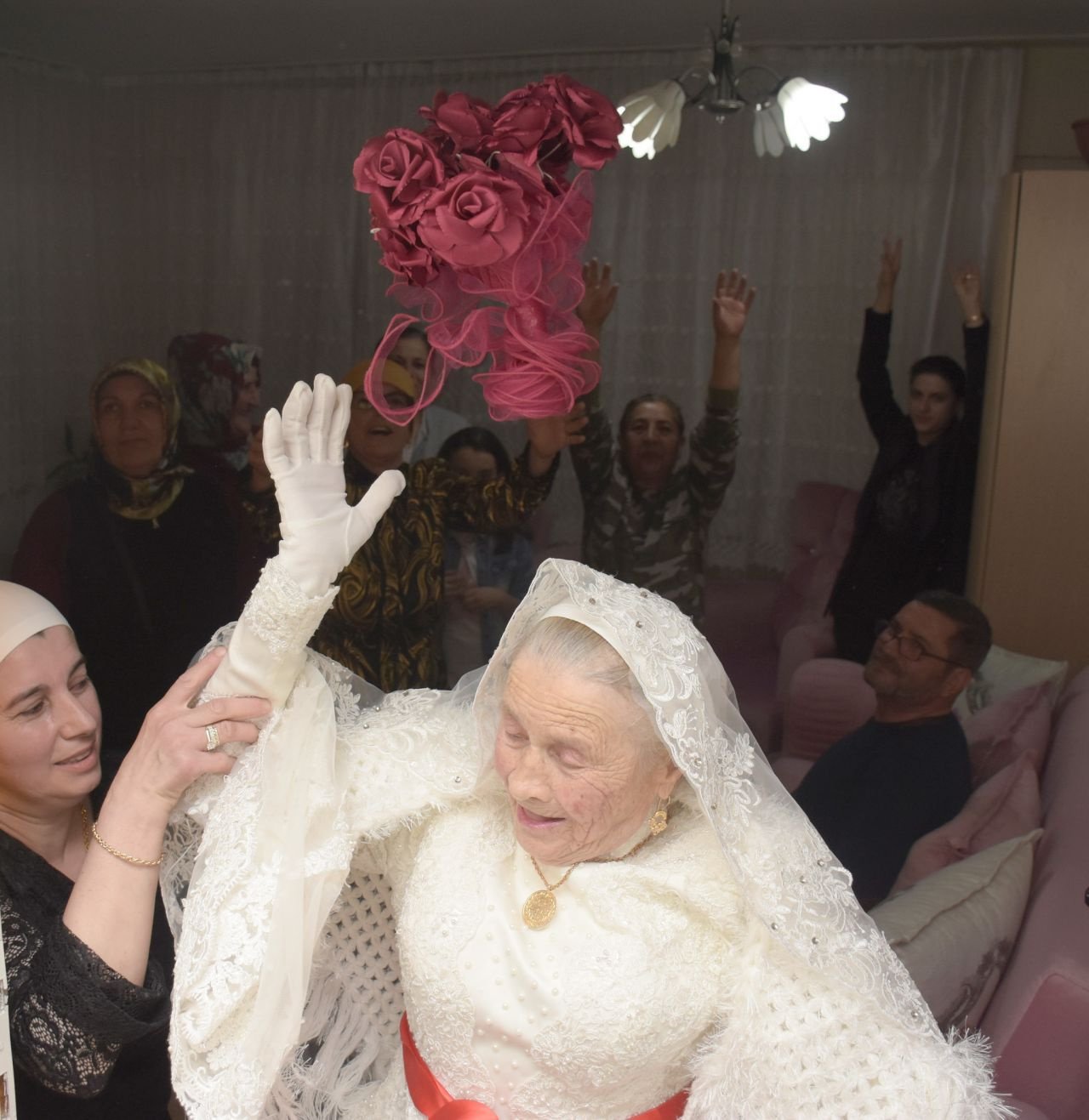 На фотографии запечатлена прекрасная бабушка, окутанная воздушной атмосферой свадьбы. В ее руках лежит нежное букет цветов, которые мерцают яркими красками на фоне ее изумительного свадебного платья. Это настоящий шедевр ремесленника - платье, созданное с заботой и любовью, словно сказочный наряд, наполненный тайнами прошлого.