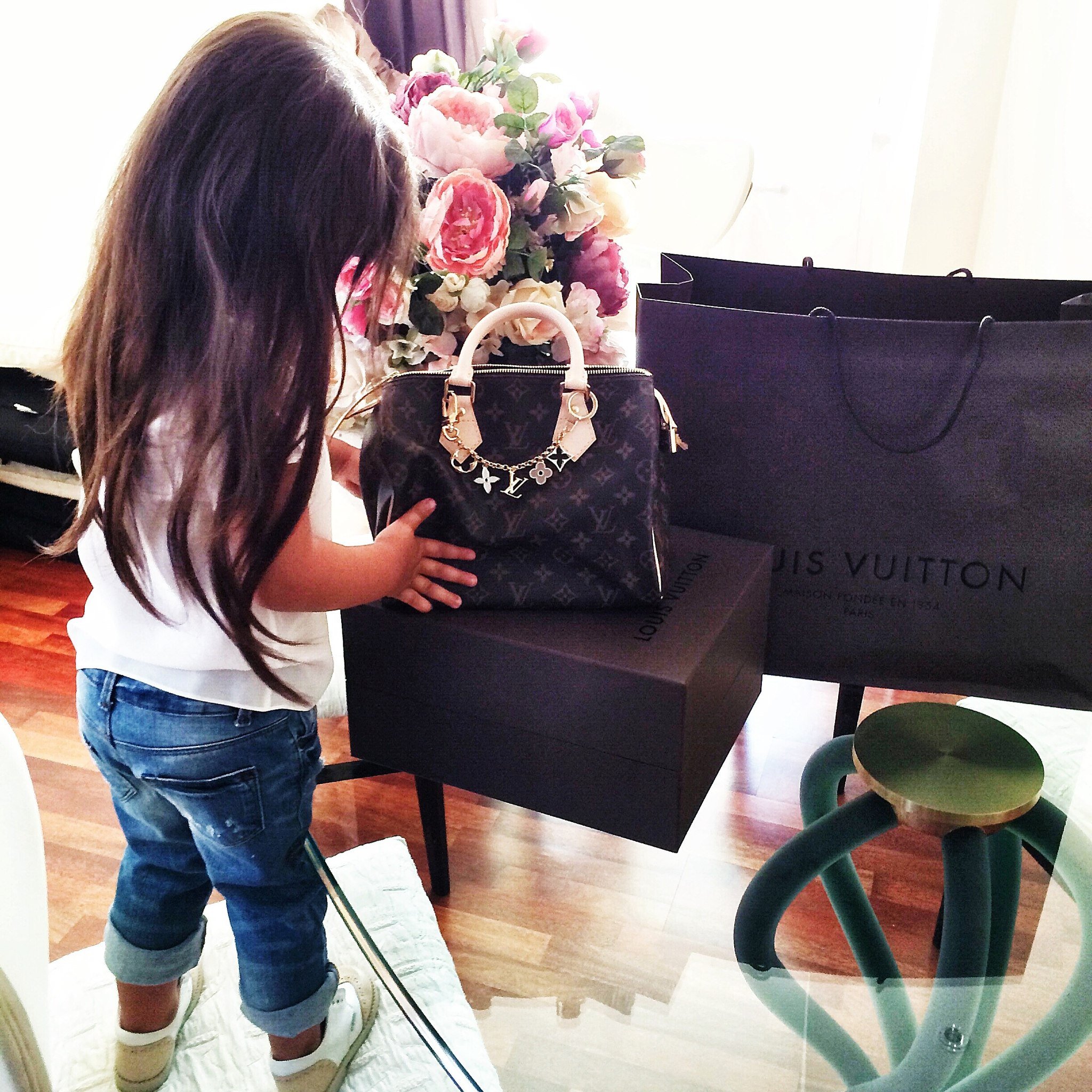 Девушка брюнетка без лица с ребенком